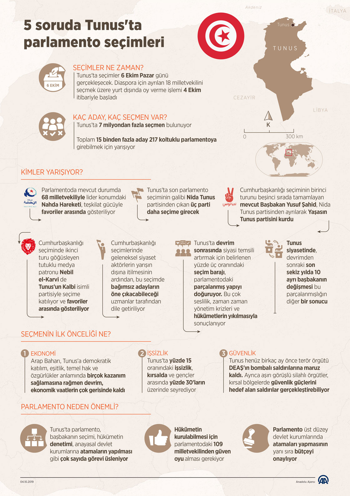 Tunuslular, 15 Eylül'de sürprizlerle tamamlanan cumhurbaşkanlığı seçiminin ardından 6 Ekim Pazar günü parlamento üyelerini belirlemek üzere sandık başına gidecek. (Anadolu Ajansı - Mahmut Resul Karaca)