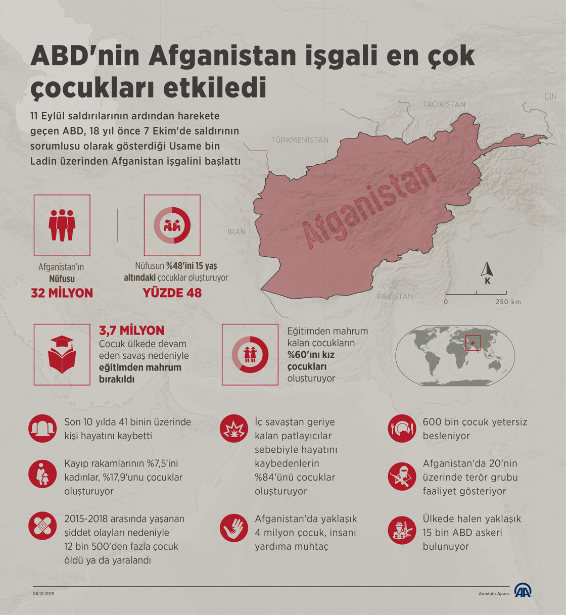 11 Eylül saldırılarının ardından harekete geçen ABD, 18 yıl önce Usame bin Ladin'i saldırının sorumlusu olarak göstererek Afganistan işgalini başlattı. ABD tarihinin en uzun savaşı olarak tarihe geçen işgal bugün hala sürerken binlerce sivil katledildi ve bu savaştan en çok Afgan çocukları zarar gördü.