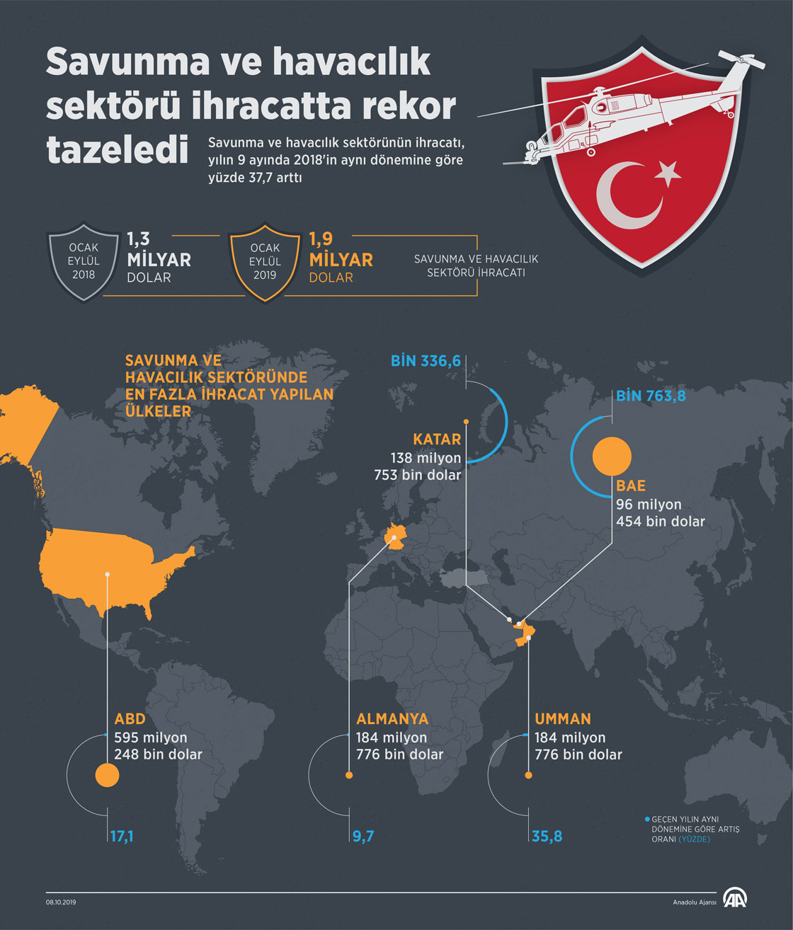 Savunma ve havacılık sektörü, yılın 9 ayındaki ihracatını 2018'in aynı dönemine göre yüzde 37,7 artırarak 1,9 milyar dolara çıkardı. Böylece, sektör söz konusu dönemde gerçekleştirilen en yüksek ihracat rakamına ulaşmış oldu. ( Yasin Demirci - Anadolu Ajansı )08 Ekim 2019•Güncelleme: 08 Ekim 2019