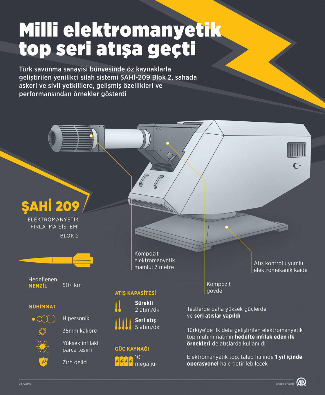 Türk savunma sanayisi bünyesinde öz kaynaklarla geliştirilen yenilikçi elektromanyetik silah sistemi ŞAHİ-209 Blok2, sahada askeri ve sivil yetkililere, gelişmiş özellikleri ve performansından seri atışlarla örnekler gösterdi. ( Murat Usubaliev - Anadolu Ajansı )08 Ekim 2019•Güncelleme: 08 Ekim 2019