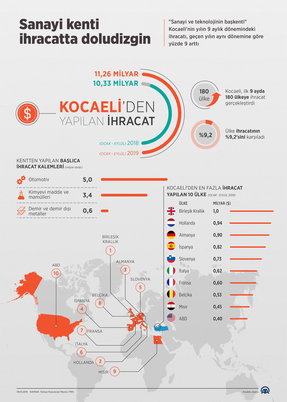 Kocaeli'nin ocak-eylül dönemindeki ihracatı, geçen yılın aynı dönemine göre yüzde 9 artarak 11,2 milyar dolara yükseldi. İhracat artışında kimya sektörünün dış satımının yüzde 35 büyümesi etkili oldu. ( Mahmut Resul Karaca - Anadolu Ajansı )