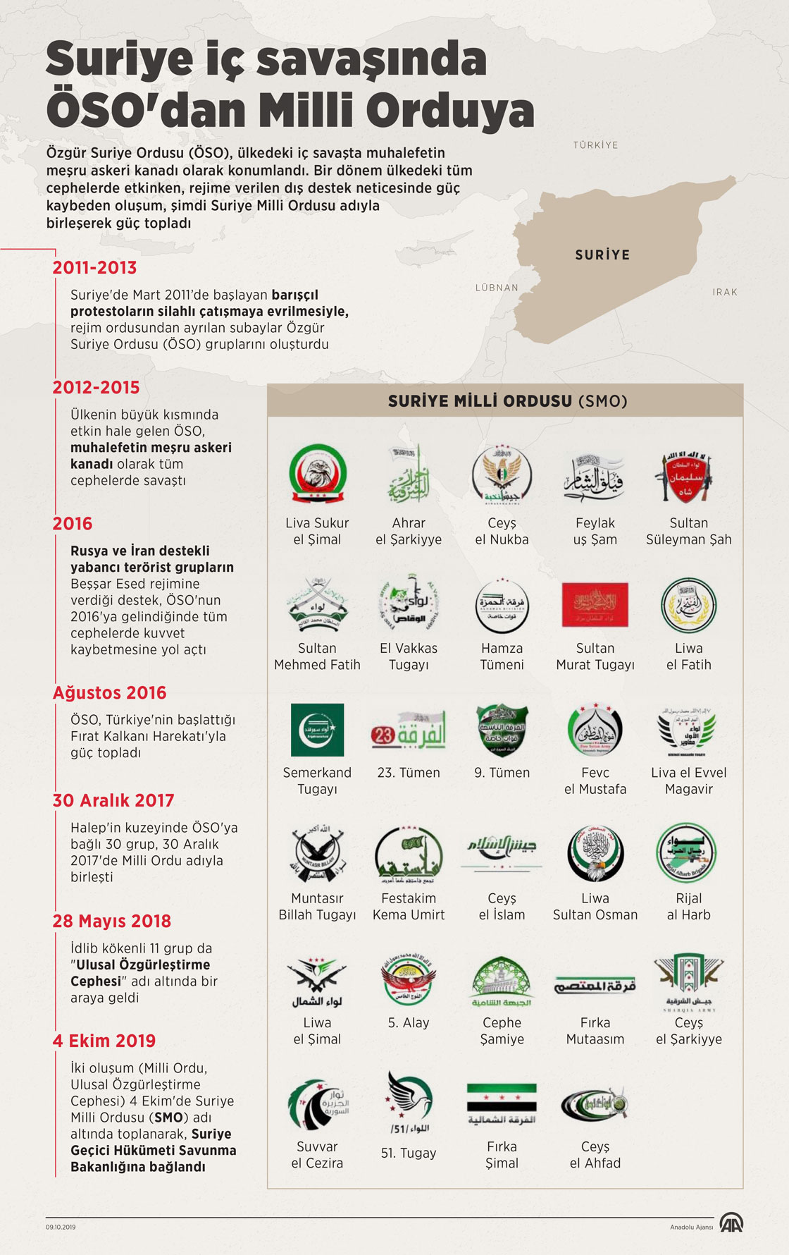 Özgür Suriye Ordusu (ÖSO), ülkedeki iç savaşta muhalefetin meşru askeri kanadı olarak konumlandı. Bir dönem ülkedeki tüm cephelerde etkinken, rejime verilen dış destek neticesinde güç kaybeden oluşum, şimdi Suriye Milli Ordusu (SMO) adıyla birleşerek güç topladı. ( Murat Usubaliev - Anadolu Ajansı )09 Ekim 2019•Güncelleme: 09 Ekim 2019