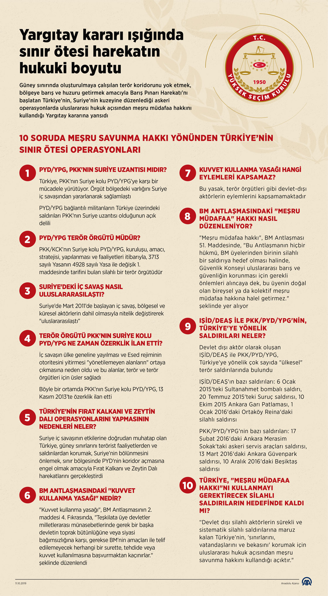 Güney sınırında oluşturulmaya çalışılan terör koridorunu yok etmek, bölgeye barış ve huzuru getirmek amacıyla Barış Pınarı Harekatı'nı başlatan Türkiye'nin, Suriye'nin kuzeyine düzenlediği askeri operasyonlarda uluslararası hukuk açısından meşru müdafaa hakkını kullandığı Yargıtay kararına yansıdı. (Anadolu Ajansı - Muhammed Ali Yiğit)11 Ekim 2019•Güncelleme: 11 Ekim 2019