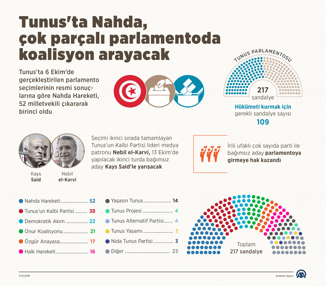 Tunus'ta 6 Ekim’de gerçekleştirilen parlamento seçimlerinin resmi sonuçlarına göre Nahda Hareketi, 52 milletvekili çıkararak birinci oldu. (Anadolu Ajansı - Murat Usubaliev)
