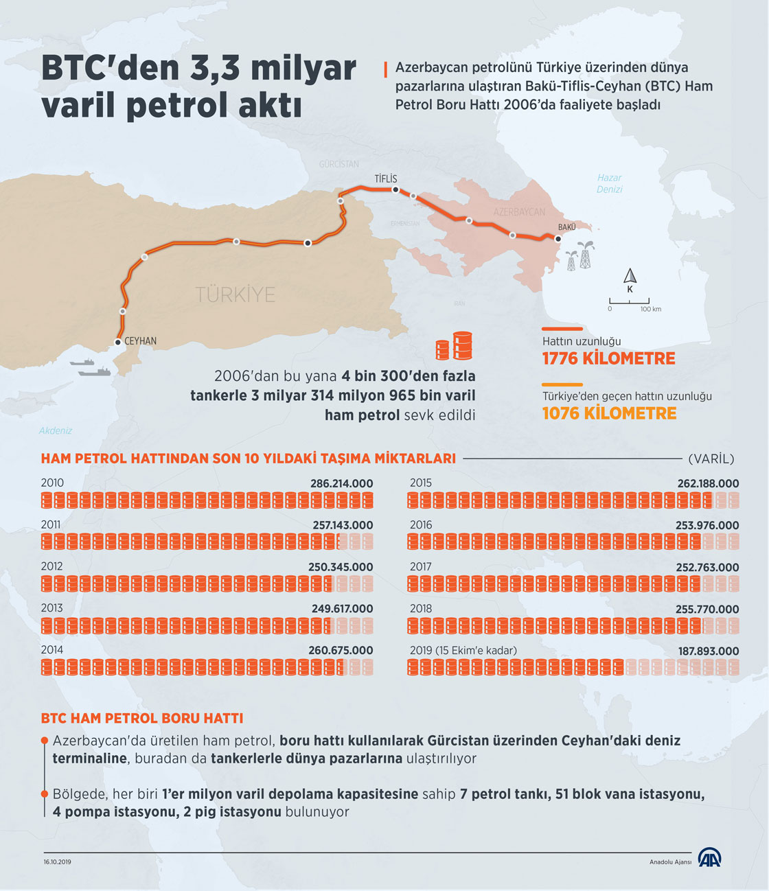Azerbaycan petrolünü Türkiye üzerinden dünya pazarlarına ulaştıran Bakü-Tiflis-Ceyhan (BTC) Ham Petrol Boru Hattı'nın Ceyhan'daki deniz terminalinden 2006 yılından bu yana yüklenen ham petrol, 3 milyar 314 milyon 965 bin 318 varile ulaştı. ( Muhammed Ali Yiğit - Anadolu Ajansı )16 Ekim 2019•Güncelleme: 16 Ekim 2019