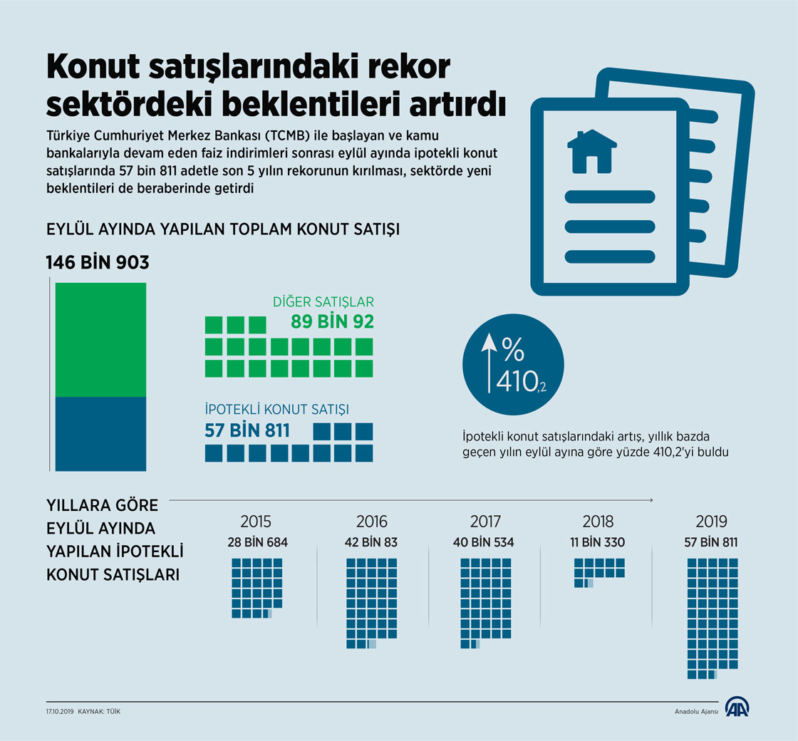 Türkiye Cumhuriyet Merkez Bankası (TCMB) ile başlayan ve kamu bankalarıyla devam eden faiz indirimleri sonrası eylül ayında ipotekli konut satışlarında 57 bin 811 adetle son 5 yılın rekorunun kırılması, sektörde yeni beklentileri de beraberinde getirdi ( grafik: Mahmut Resul Karaca - Anadolu Ajansı )17 Ekim 2019•Güncelleme: 17 Ekim 2019