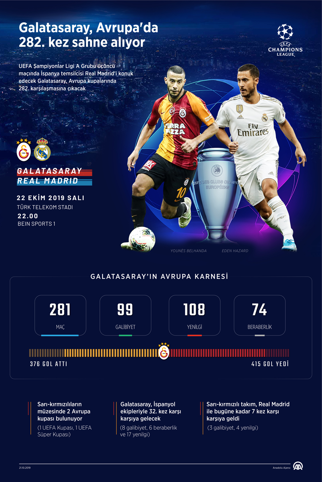 UEFA Şampiyonlar Ligi A Grubu üçüncü maçında İspanya temsilcisi Real Madrid'i konuk edecek Galatasaray, Avrupa kupalarında 282. karşılaşmasına çıkacak.