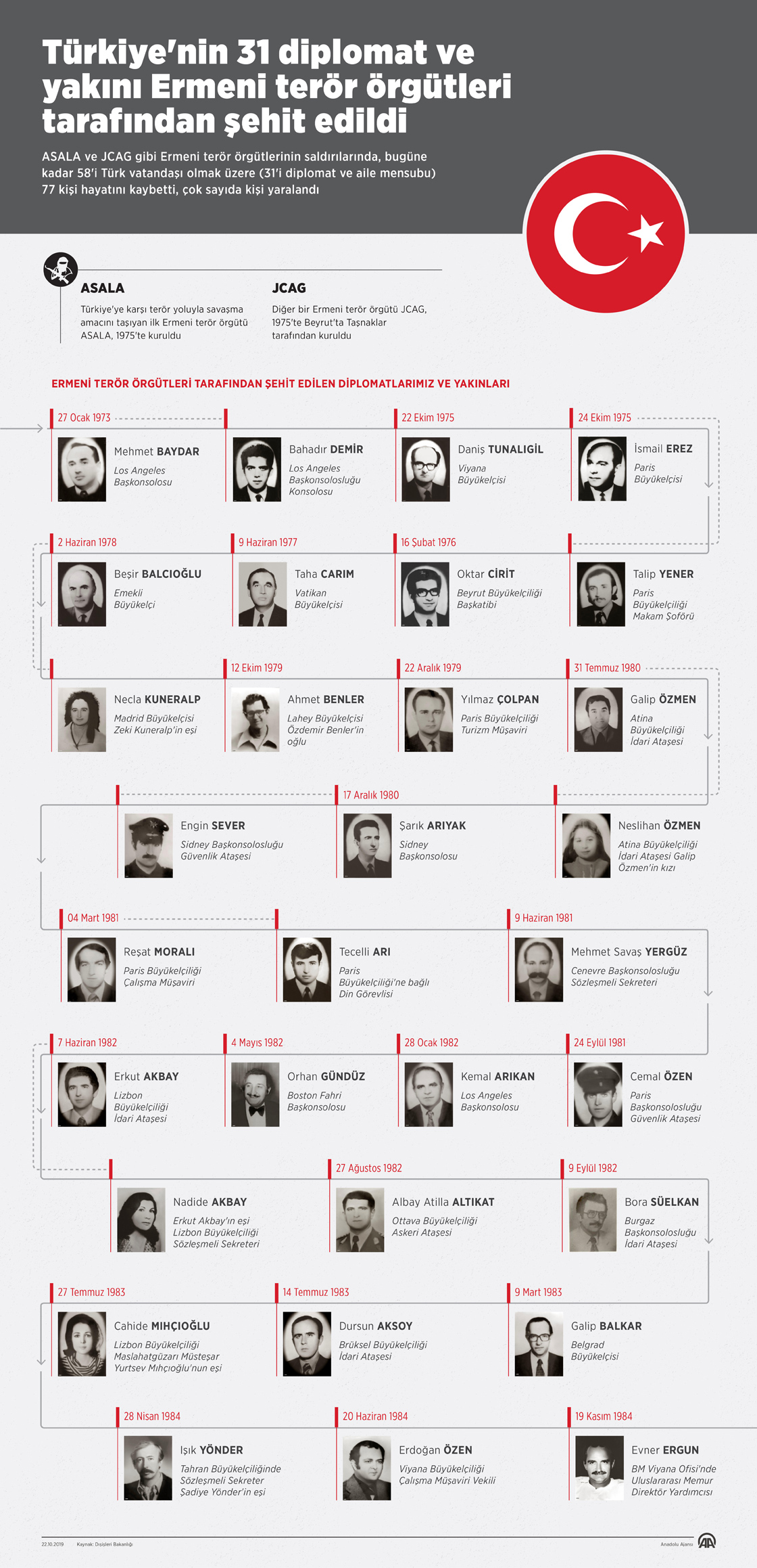 ASALA ve JCAG gibi Ermeni terör örgütlerinin saldırılarında, bugüne kadar 58'i Türk vatandaşı olmak üzere (31'i diplomat ve aile mensubu) 77 kişi hayatını kaybetti, çok sayıda kişi yaralandı.