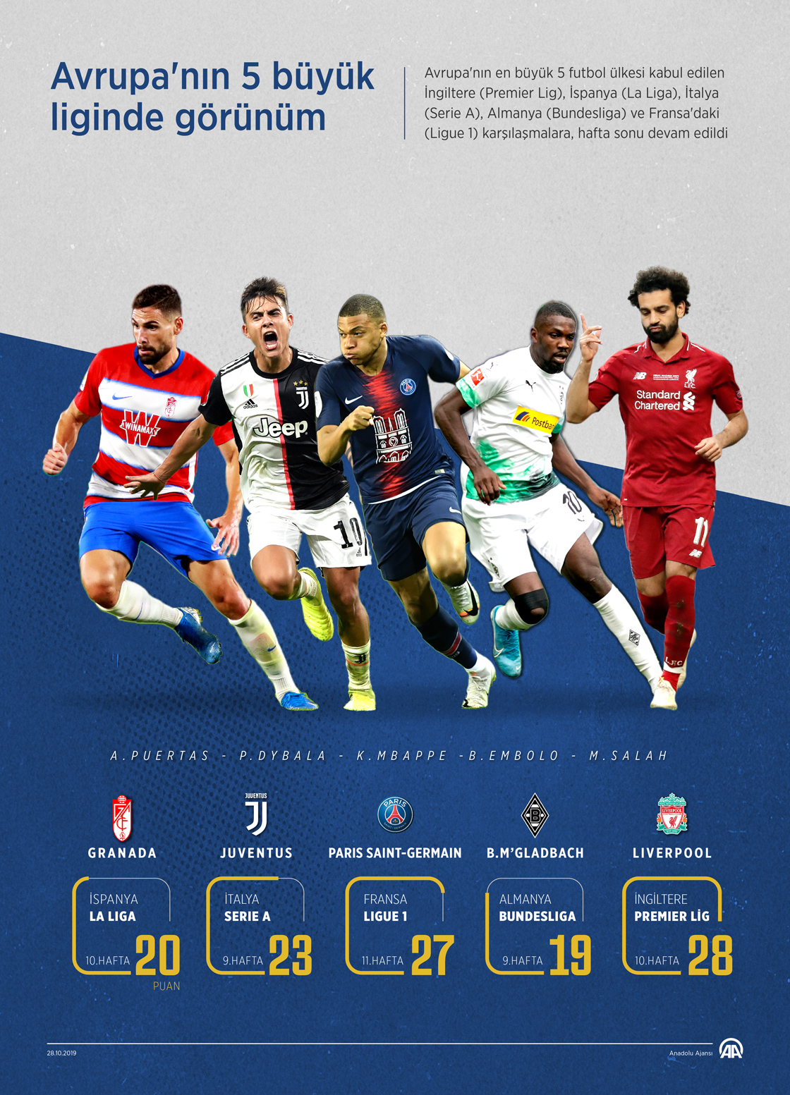 Avrupa'nın en büyük 5 futbol ligi kabul edilen İngiltere (Premier Lig), İspanya (La Liga), İtalya (Serie A), Almanya (Bundesliga) ve Fransa'daki (Ligue 1) karşılaşmalara, hafta sonu devam edildi. ( Mahmut Resul Karaca - Anadolu Ajansı )