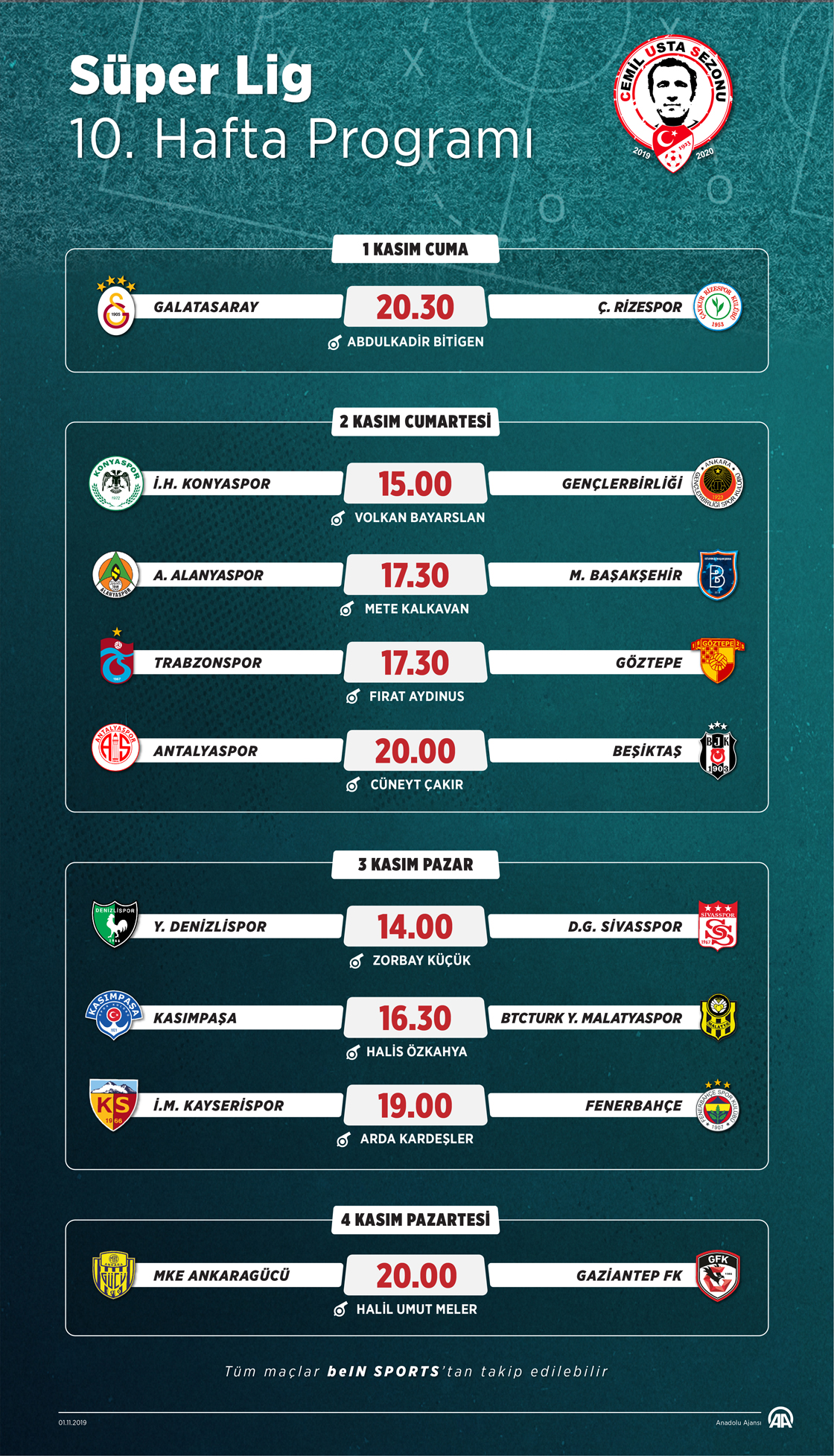 Süper Lig'in 10. haftasında ilk maç 1 Kasım Cuma günü Galatasaray ile Çaykur Rizespor arasında yapılacak. 2 Kasım Cumartesi 4, 3 Kasım Pazar günü 3 maç oynanacak. 4 Kasım Pazartesi günü ise 1 maç ile tamamlanacak.