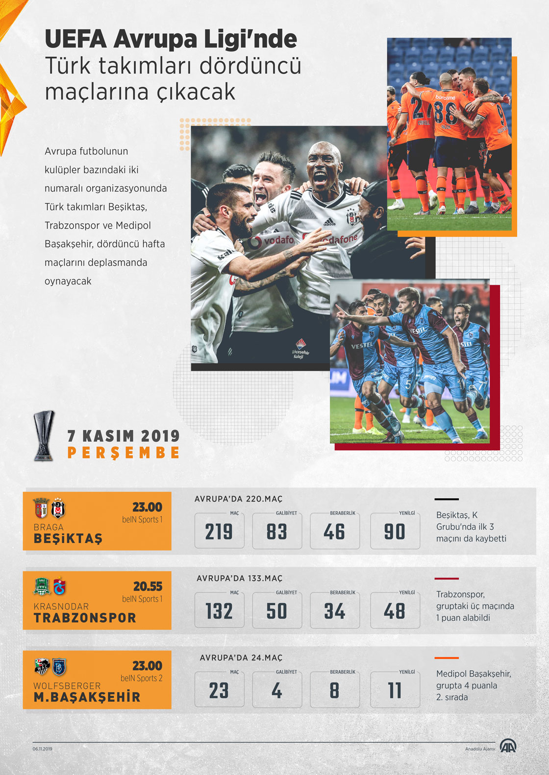 Avrupa futbolunun kulüpler bazındaki iki numaralı organizasyonunda Türk takımları Beşiktaş, Trabzonspor ve Medipol Başakşehir, dördüncü hafta maçlarını deplasmanda oynayacak