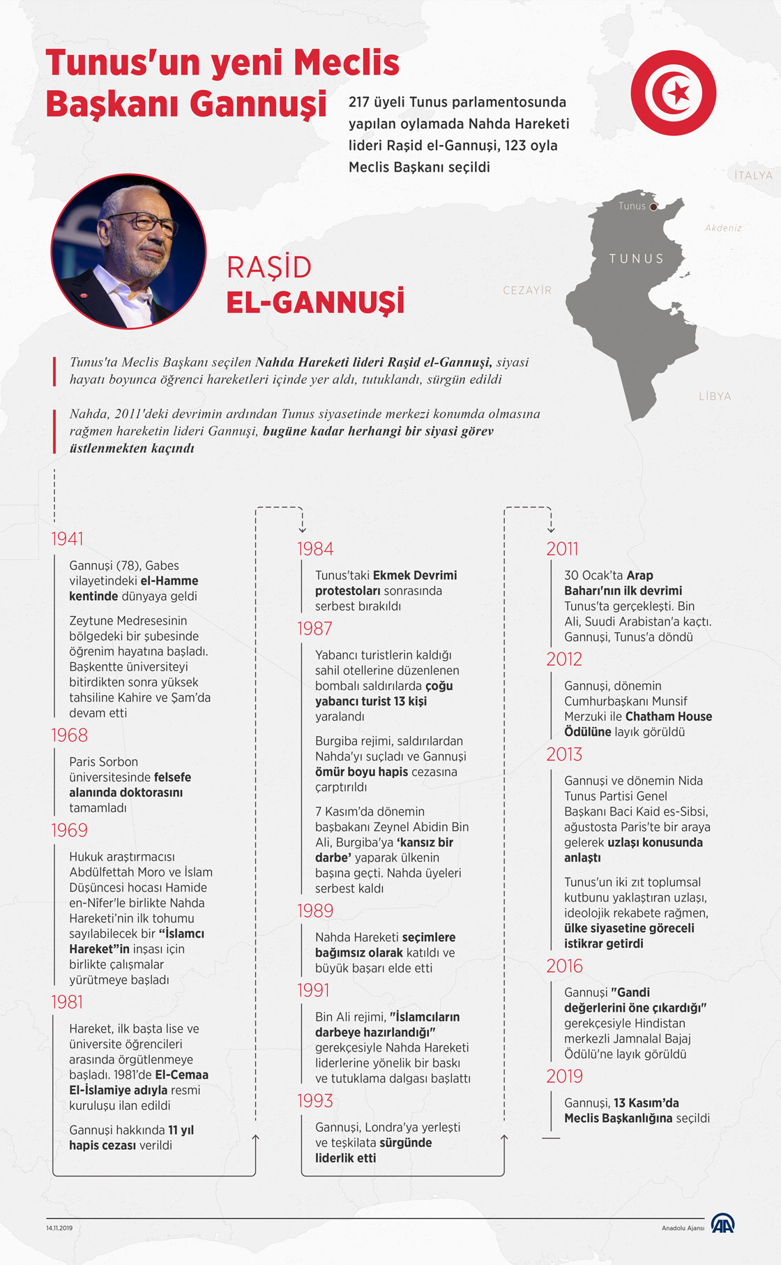 Tunus'ta Meclis Başkanı seçilen 78 yaşındaki Raşid el-Gannuşi, siyasi geçmişi ile dikkati çekiyor. Tunus'ta geçen ay yapılan genel seçimlerin ardından parlamentoda açılış oturumu dün gerçekleştirildi. Nahda Hareketi lideri Gannuşi, 217 üyeli parlamentoda 123 oyla Meclis Başkanı seçildi. Nahda, 2011'deki devrimin ardından Tunus siyasetinde merkezi konumda yer alsa da hareketin lideri Gannuşi, bugüne kadar herhangi bir siyasi görev üstlenmekten kaçınmıştı.