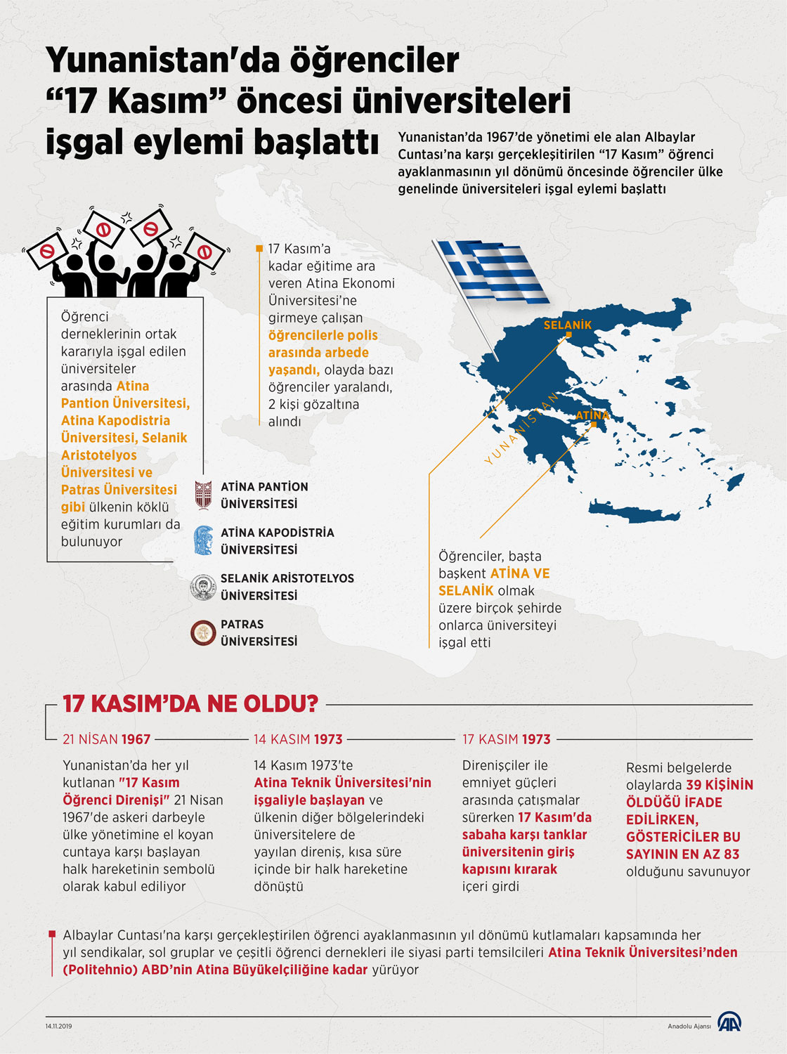 Yunanistan’da 1967’de yönetime el koyan Albaylar Cuntası'na karşı yapılan "17 Kasım" öğrenci ayaklanmasının yıl dönümünden önce ülke genelinde birçok üniversite öğrenciler tarafından işgal edildi. (Anadolu Ajansı - Yasin Demirci)14 Kasım 2019•Güncelleme: 14 Kasım 2019