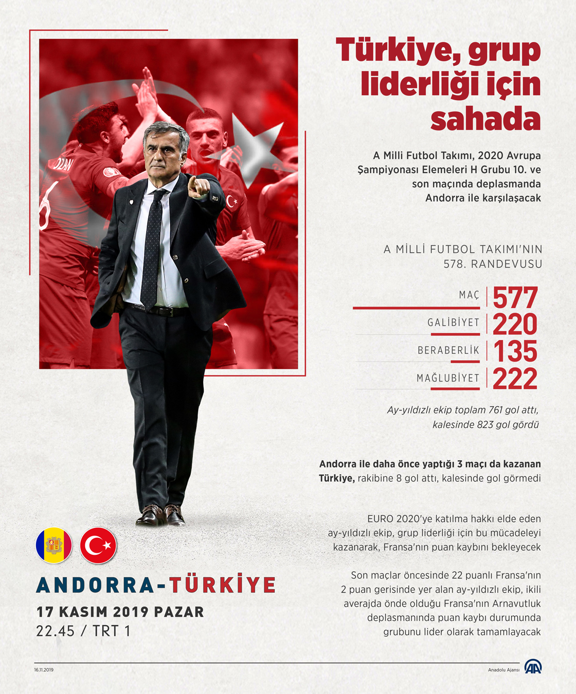 A Milli Futbol Takımı, 2020 Avrupa Şampiyonası (EURO 2020) Elemeleri H Grubu 10. ve son maçında yarın deplasmanda Andorra ile karşı karşıya gelecek.
