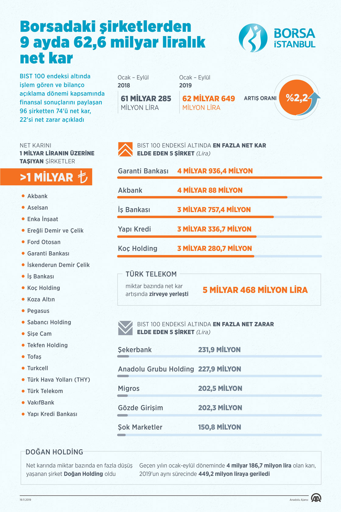 Borsa İstanbul'da BIST 100 endeksi altında işlem gören şirketlerin net karı, 2019'un ocak-eylül döneminde geçen yılın aynı sürecine göre yüzde 2,2 artarak 62 milyar 649 milyon liraya çıktı. ( Murat Usubaliev - Anadolu Ajansı )