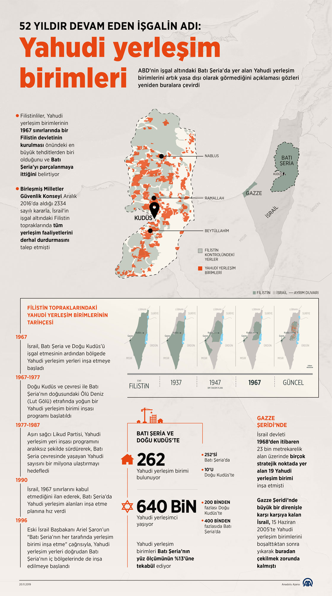 ABD'nin işgal altındaki Batı Şeria'da yer alan Yahudi yerleşim birimlerini artık yasa dışı olarak görmediğini açıklaması gözleri yeniden bu bölgelere çevirdi. ( Yasin Demirci - Anadolu Ajansı )