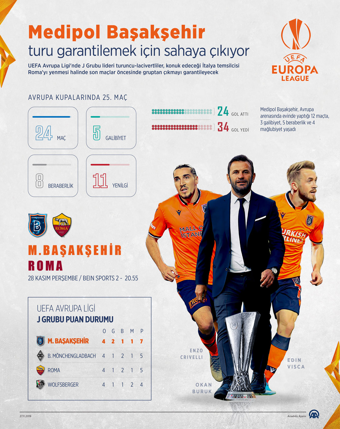 UEFA Avrupa Ligi J Grubu'nda 28 Kasım'da Roma'yı konuk edecek turuncu-lacivertliler, Avrupa kupalarındaki 25. maçını oynayacak. Turuncu-lacivertliler, İtalyan rakibini yenmesi halinde son maçlar öncesinde gruptan çıkmayı garantileyecek. İstanbul ekibinin, Avrupa kupalarında çıktığı 24 maçta 5 galibiyet, 8 beraberlik ve 11 mağlubiyeti bulunuyor. ( Muhammed Ali Yiğit - Anadolu Ajansı )27 Kasım 2019•Güncelleme: 27 Kasım 2019