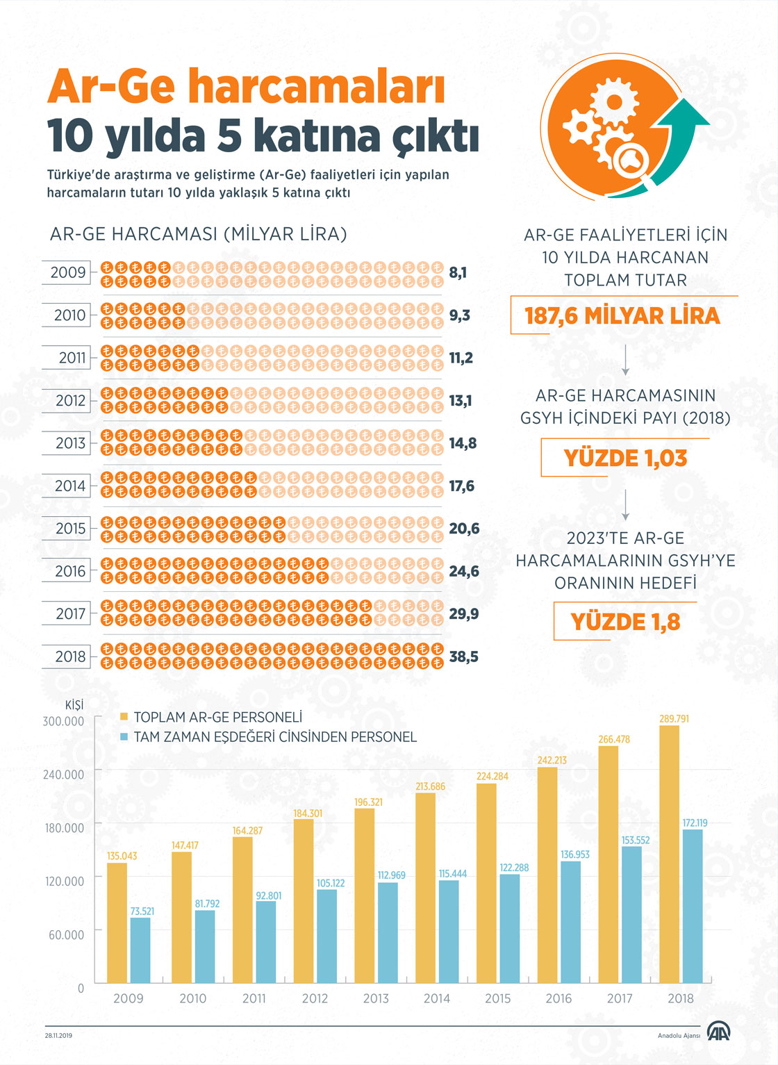 Türkiye'de araştırma ve geliştirme (Ar-Ge) faaliyetleri için yapılan harcamaların tutarı 10 yılda yaklaşık 5 katına çıkarak toplam 187,6 milyar liraya ulaştı.