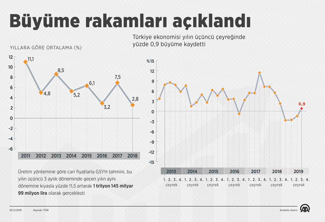 Türkiye ekonomisi yılın üçüncü çeyreğinde yüzde 0,9 büyüme kaydetti. Üretim yöntemine göre cari fiyatlarla GSYH tahmini, bu yılın üçüncü 3 aylık döneminde geçen yılın aynı dönemine kıyasla yüzde 11,5 artarak 1 trilyon 145 milyar 99 milyon lira olarak gerçekleşti.