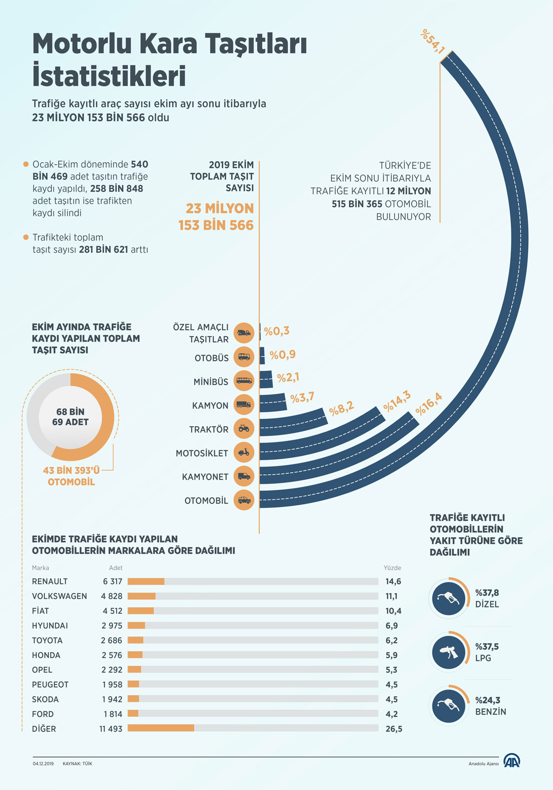 Türkiye İstatistik Kurumu, ekim ayına ilişkin motorlu kara taşıtları istatistiklerini açıkladı. Ocak-ekim döneminde trafikten 258 bin 848 taşıtın kaydı silindi, böylece söz konusu dönemde trafikteki toplam taşıt sayısı 281 bin 621 arttı. Trafiğe kayıtlı araç sayısı, ekim sonu itibarıyla geçen yılın aynı dönemine göre yüzde 1,47 artarak 23 milyon 153 bin 556 oldu. ( Mahmut Resul Karaca - Anadolu Ajansı )04 Aralık 2019•Güncelleme: 04 Aralık 2019