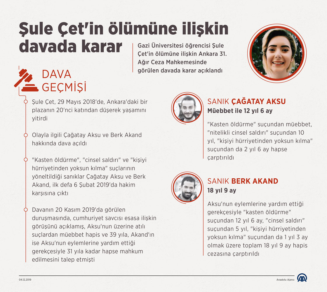 Şule Çet'in ölümüne ilişkin davada sanıklardan Çağatay Aksu hakkında "kasten öldürme" suçundan müebbet, "cinsel saldırı" ve "kişiyi hürriyetinden yoksun kılma" suçlarından 12 yıl 6 ay, Berk Akand hakkında ise Aksu'ya bu suçların işlenmesinde yardım ettiği gerekçesiyle toplam 18 yıl 9 ay hapis cezası verildi. ( Muhammed Ali Yiğit - Anadolu Ajansı )04 Aralık 2019•Güncelleme: 04 Aralık 2019