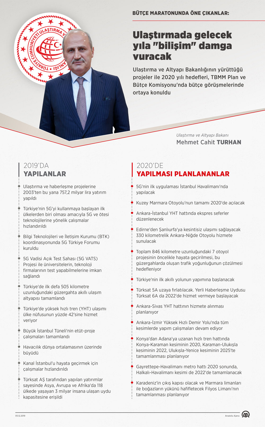 TBMM Plan ve Bütçe Komisyonunda 2020 bütçesi üzerindeki görüşmeler tamamlandı. Komisyonda yapılan sunumlarla Bakanlıkların 2019 yılı çalışmaları ve 2020 hedefleri ayrıntılı olarak kamuoyuna açıklandı. Ulaştırma ve Altyapı Bakanlığının yürüttüğü projeler ile 2020 yılı hedefleri, TBMM Plan ve Bütçe Komisyonu'nda tamamlanan bütçe görüşmelerinde ortaya konuldu. ( Kemal Delikmen - Anadolu Ajansı )05 Aralık 2019•Güncelleme: 05 Aralık 2019