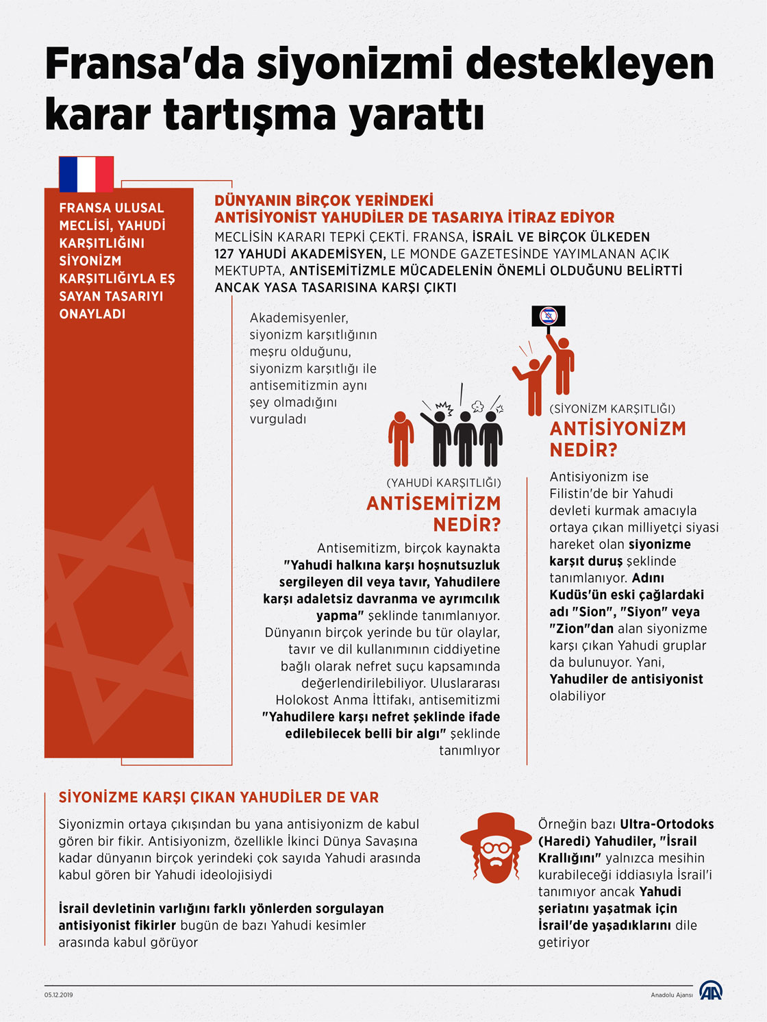Fransa Ulusal Meclisinde antisemitizm ile antisiyonizmi aynı sayan karar tasarısı, bu iki kavram arasındaki farkın önemini bir kez daha gündeme getirdi. Kavramlar arasındaki net ayrıma rağmen Fransız meclisinin bunları eş değer sayması, kararının doğruluğunu tartışmaya açtı. ( Yasin Demirci - Anadolu Ajansı )05 Aralık 2019•Güncelleme: 05 Aralık 2019
