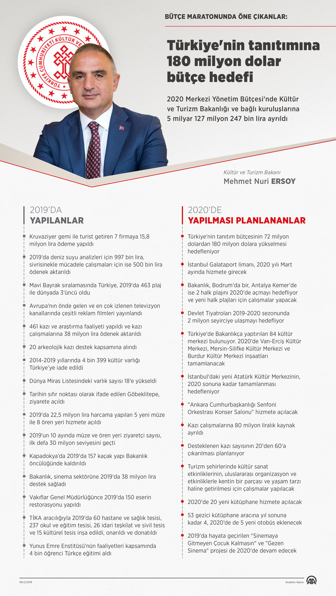 TBMM Plan ve Bütçe Komisyonunda 2020 bütçesi üzerindeki görüşmeler tamamlandı. Komisyonda yapılan sunumlarla Bakanlıkların 2019 yılı çalışmaları ve 2020 hedefleri ayrıntılı olarak kamuoyuna açıklandı. Kültür ve Turizm Bakanlığı'nın bütçesinde 2020'de Türkiye Turizm Tanıtım ve Geliştirme Ajansı ile Türkiye'nin tanıtımına ayrılan miktarın 180 milyon dolara yükselmesi hedefleniyor. (Anadolu Ajansı - Kemal Delikmen)06 Aralık 2019•Güncelleme: 06 Aralık 2019