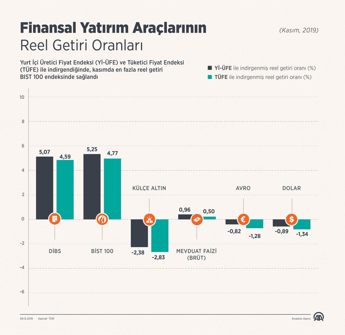 Yurt İçi Üretici Fiyat Endeksi (Yİ-ÜFE) ve Tüketici Fiyat Endeksi (TÜFE) ile indirgendiğinde, kasımda en fazla reel getiri BIST 100 endeksinde sağlandı.