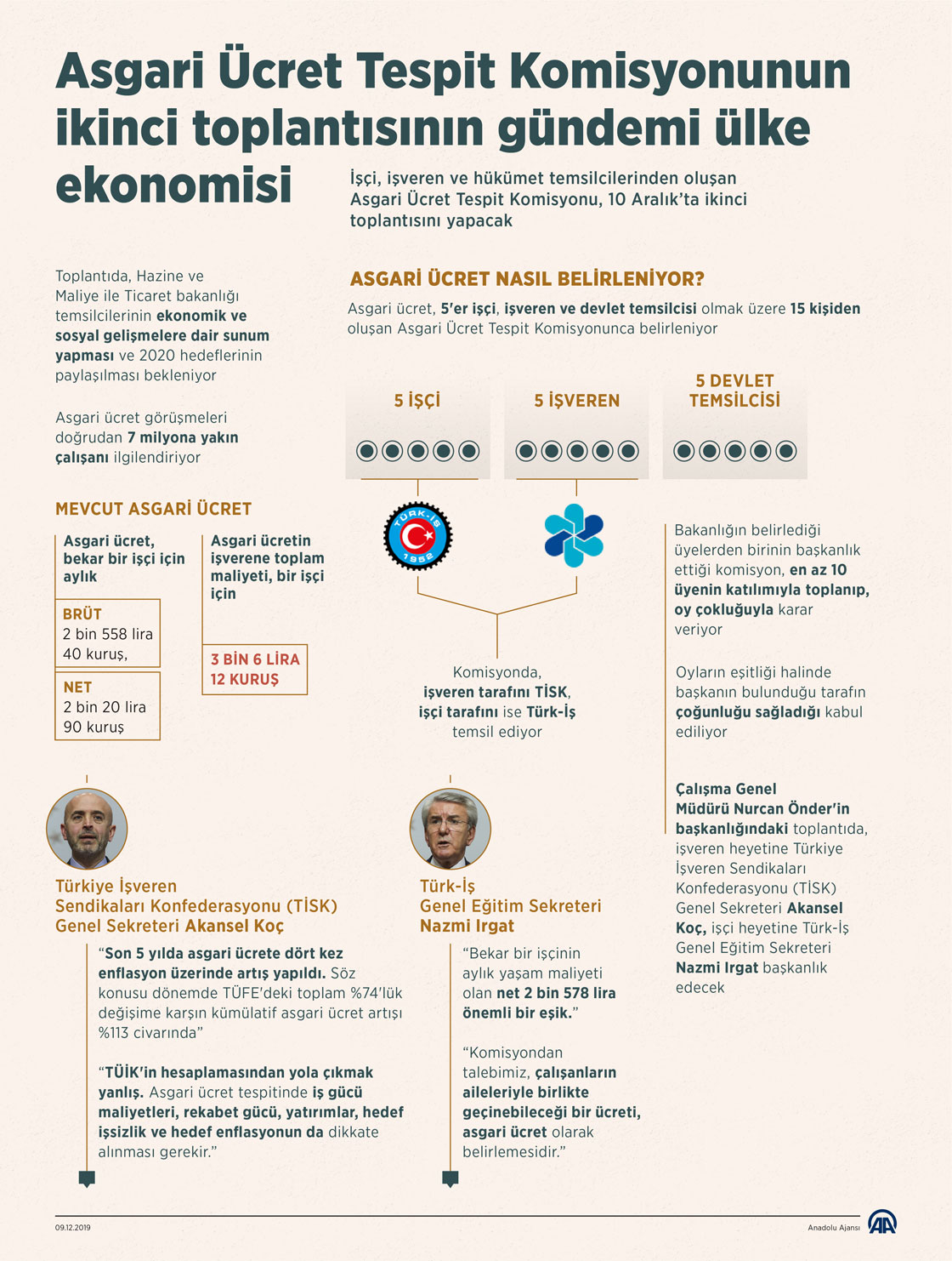 İşçi, işveren ve hükümet temsilcilerinden oluşan Asgari Ücret Tespit Komisyonu, 2020'de geçerli olacak asgari ücreti belirleme çalışmaları kapsamında yarın ikinci toplantısını yapacak. ( Yasin Demirci - Anadolu Ajansı )09 Aralık 2019•Güncelleme: 09 Aralık 2019