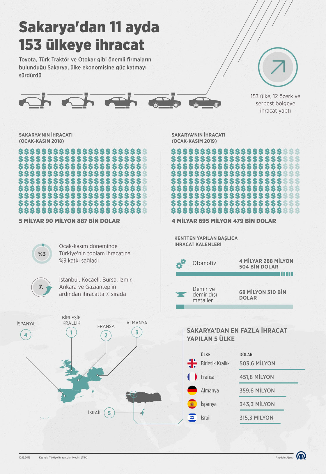 Sakaryalı ihracatçılar, bu yılın ocak-kasım döneminde 153 ülkeye 4 milyar 695 milyon 479 bin dolarlık ürün satarak ülke ekonomisine güç kattı. ( Mahmut Resul Karaca - Anadolu Ajansı )