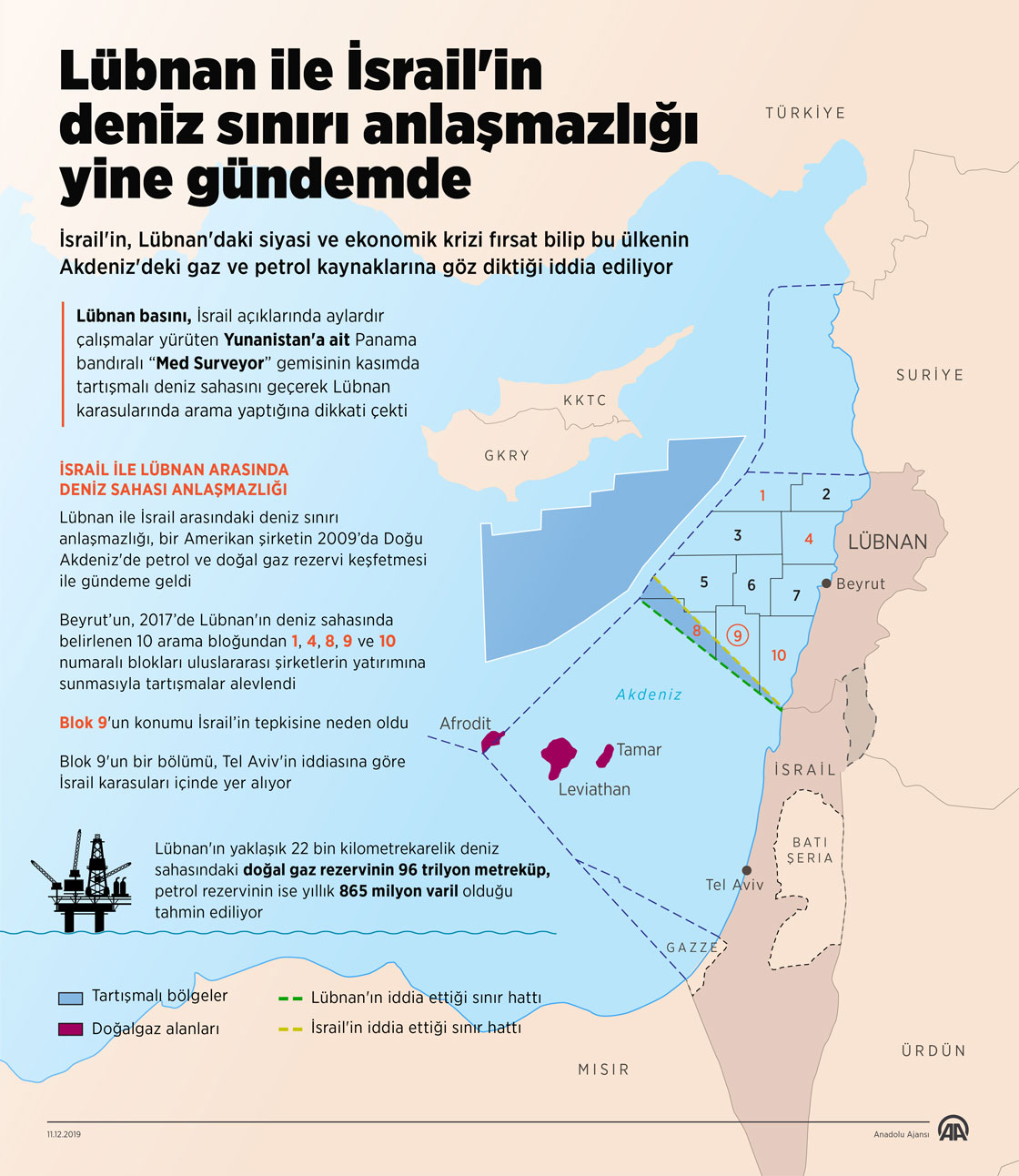 İsrail'in Lübnan karasularında petrol ve doğal gaz arama faaliyetlerinde bulunduğu iddiası, iki ülke arasında uzun yıllardır devam eden deniz sınırı anlaşmazlığını yeniden gündeme getirdi. ( Murat Usubaliev - Anadolu Ajansı )