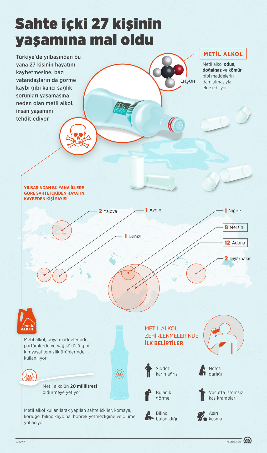 Türkiye'de yılbaşından bu yana 7 ilde 27 kişinin hayatını kaybetmesine, bazı kişilerin de görme kaybı gibi kalıcı sağlık sorunları yaşamasına neden olan metil alkol, insan yaşamını tehdit ediyor. ( Murat Usubaliev - Anadolu Ajansı )