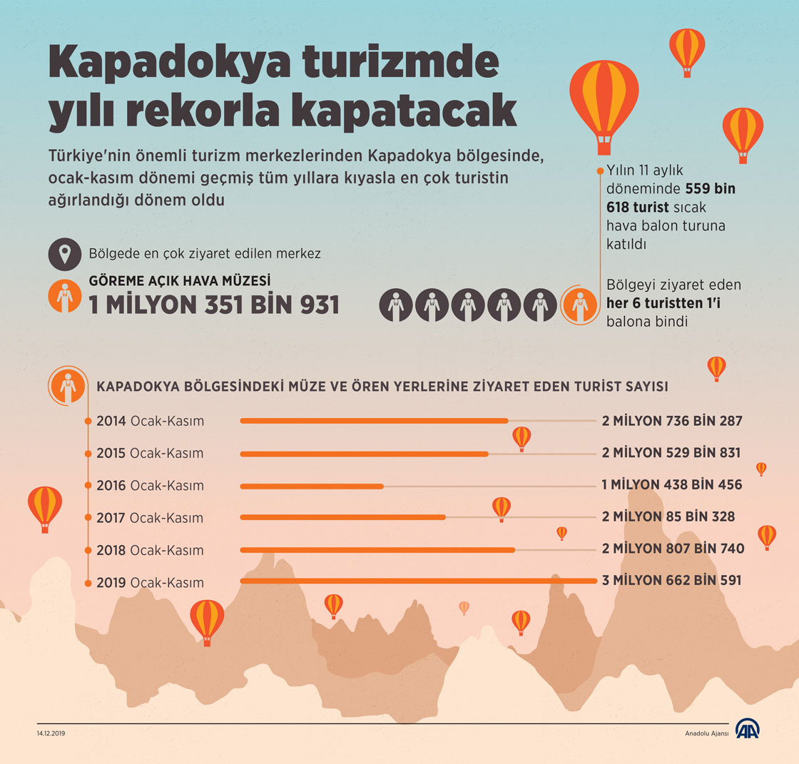 Türkiye'nin önemli turizm merkezlerinden Kapadokya bölgesinde, ocak-kasım dönemi geçmiş tüm yıllara kıyasla en çok turistin ağırlandığı dönem oldu. Yılın 11 aylık döneminde bölgedeki tarihi ve turistik merkezleri 3 milyon 662 bin 591 kişi ziyaret etti, 559 bin 618 turist sıcak hava balon turuna katıldı. (Anadolu Ajansı - Murat Usubaliev)14 Aralık 2019•Güncelleme: 14 Aralık 2019