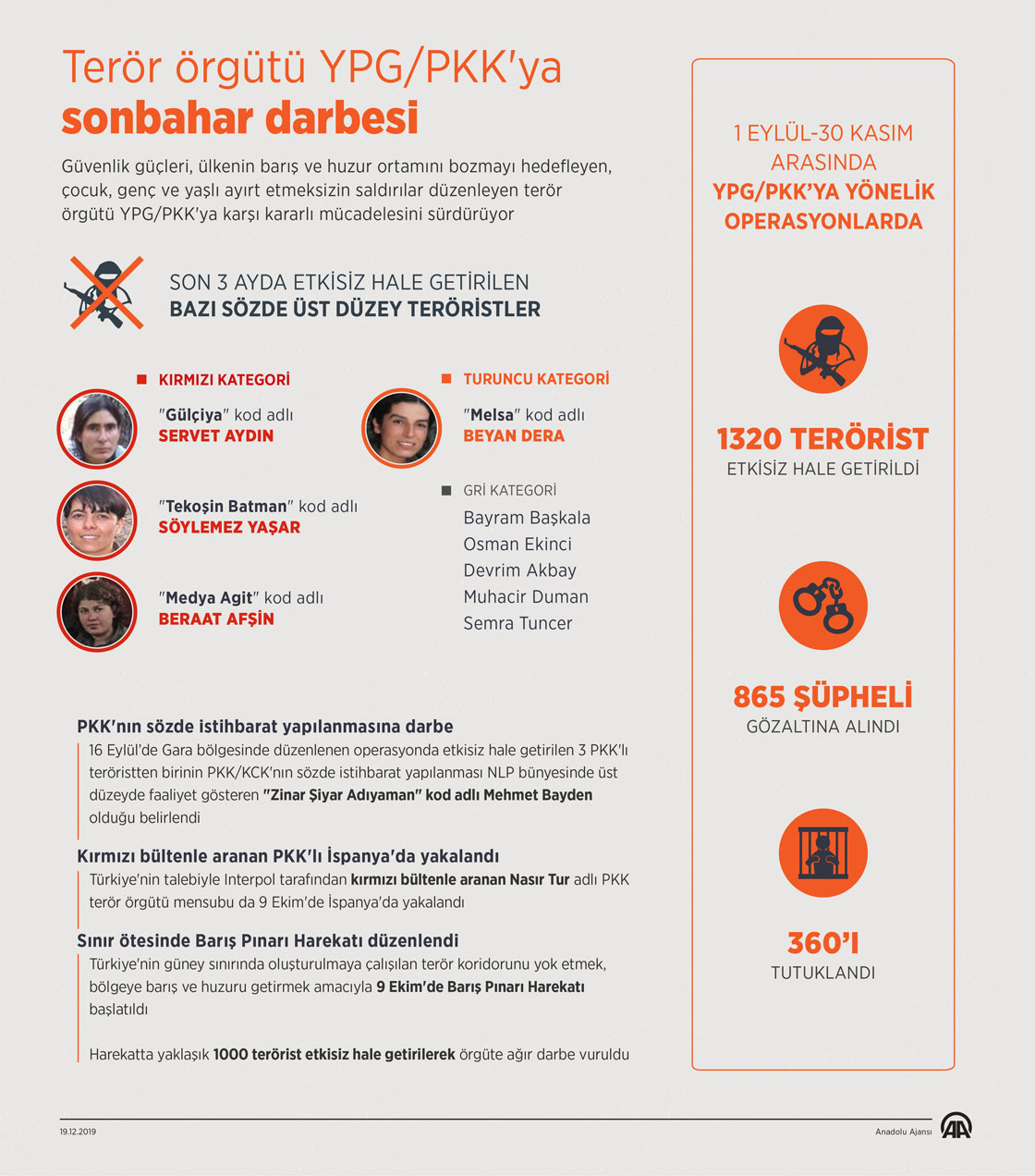 Terör örgütü YPG/PKK'ya ağır darbeler indiren güvenlik güçleri, sonbaharda ülke genelinde ve yurt dışında düzenlediği operasyonlarda 1320 teröristi etkisiz hale getirdi. ( Kemal Delikmen - Anadolu Ajansı )
