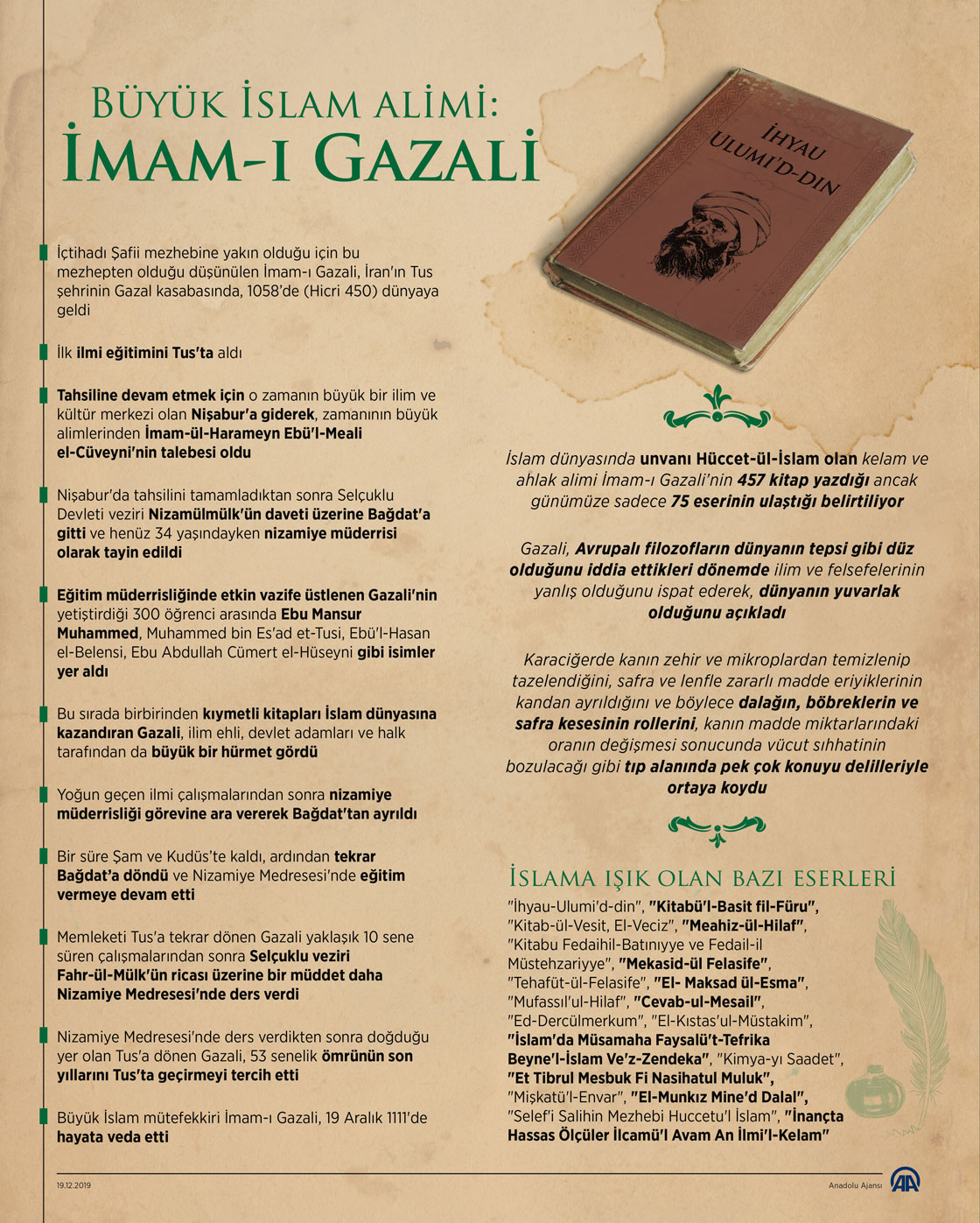 Gazali, Avrupalı filozofların dünyanın tepsi gibi düz olduğunu iddia ettikleri dönemde ilim ve felsefelerinin yanlış olduğunu ispat ederek, dünyanın yuvarlak olduğunu açıkladı. ( Mahmut Resul Karaca - Anadolu Ajansı )