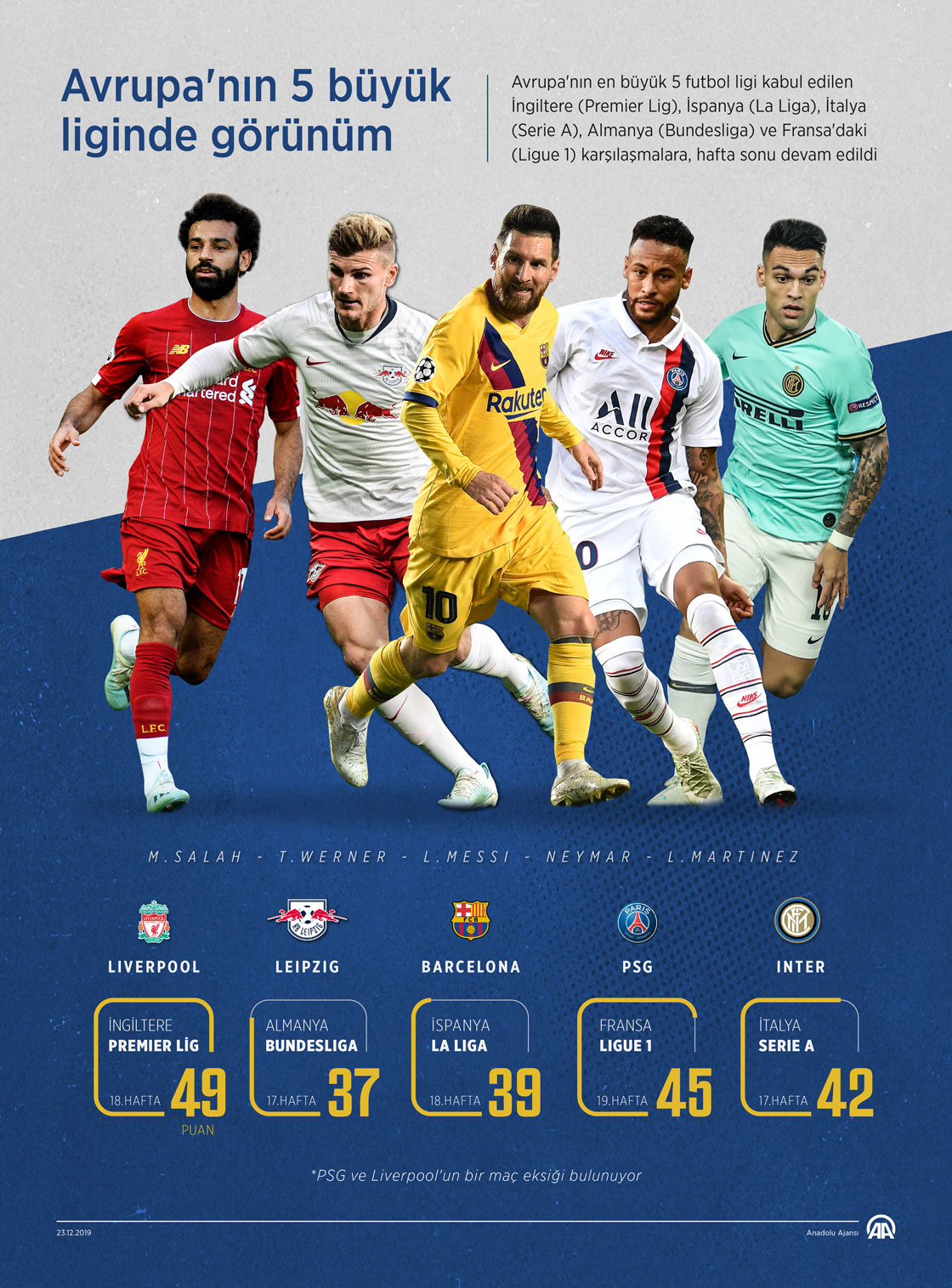 Avrupa'nın en büyük 5 futbol ligi kabul edilen İngiltere (Premier Lig), İspanya (La Liga), İtalya (Serie A), Almanya (Bundesliga) ve Fransa'daki (Ligue 1) karşılaşmalara, hafta sonu devam edildi ( Mahmut Resul Karaca - Anadolu Ajansı )