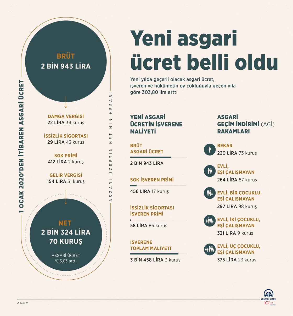 Yeni yılda geçerli olacak asgari ücret, işveren ve hükümetin oy çokluğuyla brüt 2 bin 943 lira, net 2 bin 324 lira 70 kuruş olarak belirlendi.