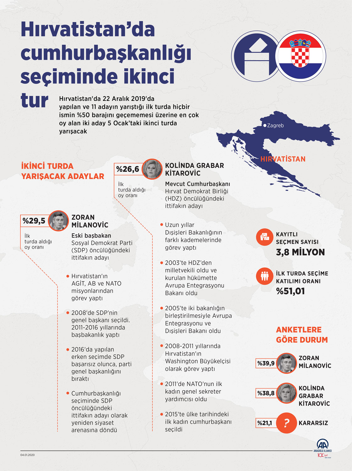 Hırvatistan'da 22 Aralık 2019'da yapılan ve 11 adayın yarıştığı ilk turda hiçbir ismin %50 barajını geçememesi üzerine en çok oy alan iki aday 5 Ocak’taki ikinci turda yarışacak. (Anadolu Ajansı - Yasin Demirci)