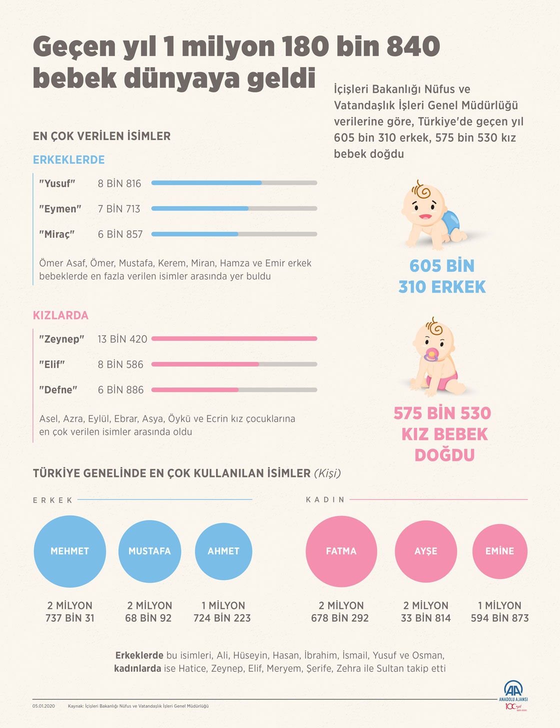 İçişleri Bakanlığı Nüfus ve Vatandaşlık İşleri Genel Müdürlüğü verilerine göre, Türkiye'de geçen yıl 605 bin 310 erkek, 575 bin 530 kız bebek doğdu. Dünyaya gelen 1 milyon 180 bin 840 bebekten, erkeklerden 8 bin 816'sına "Yusuf", 7 bin 713'üne "Eymen", 6 bin 857'sine "Miraç", kız bebeklerden de 13 bin 420'sine "Zeynep", 8 bin 586'sına "Elif", 6 bin 886'sına "Defne" ismi verildi. (Anadolu Ajansı - Elmurod Usubalıev)05 Ocak 2020•Güncelleme: 05 Ocak 2020