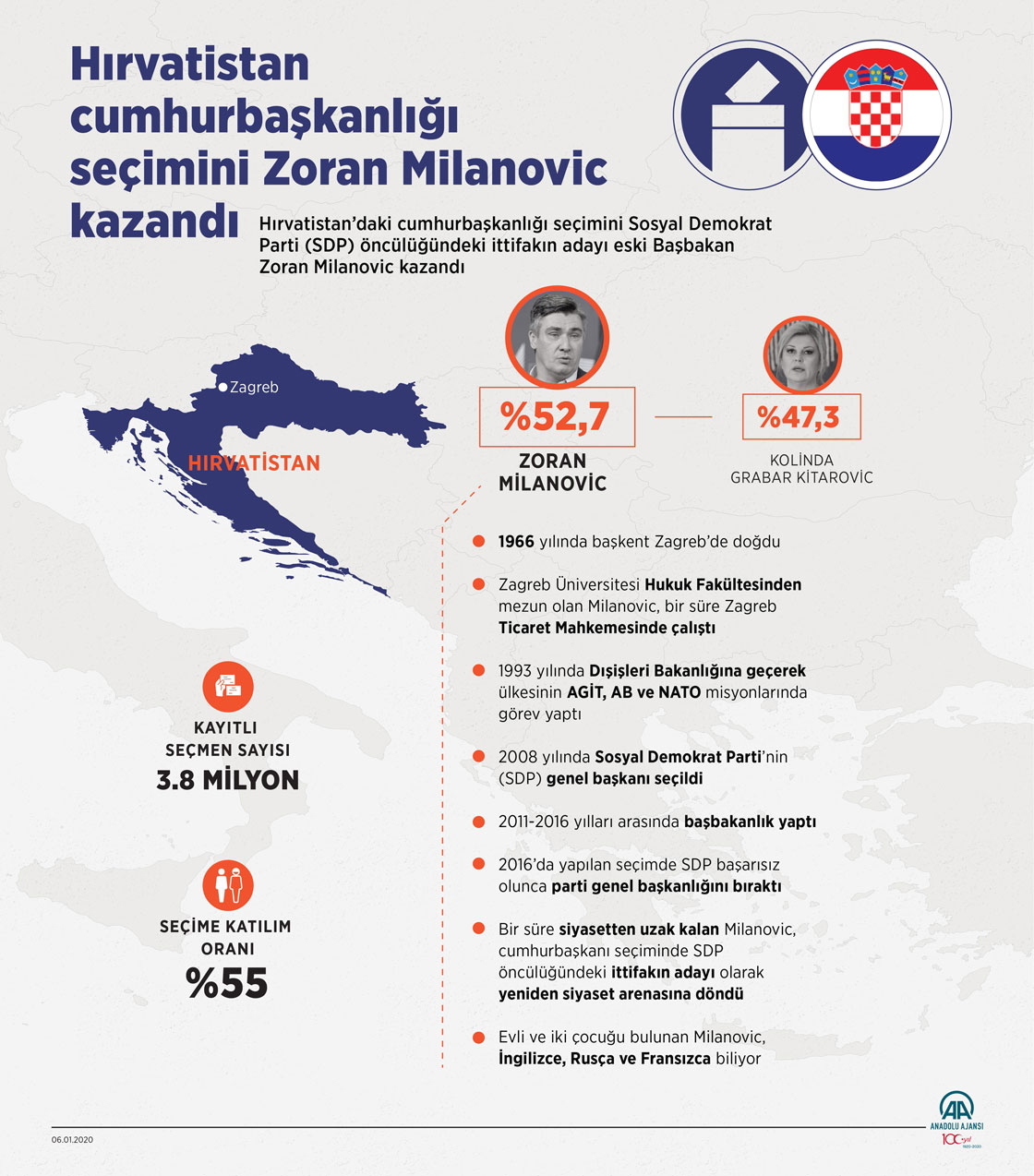 Hırvatistan’daki cumhurbaşkanlığı seçimini Sosyal Demokrat Parti (SDP) öncülüğündeki ittifakın adayı eski Başbakan Zoran Milanovic kazandı ( Mahmut Resul Karaca - Anadolu Ajansı )