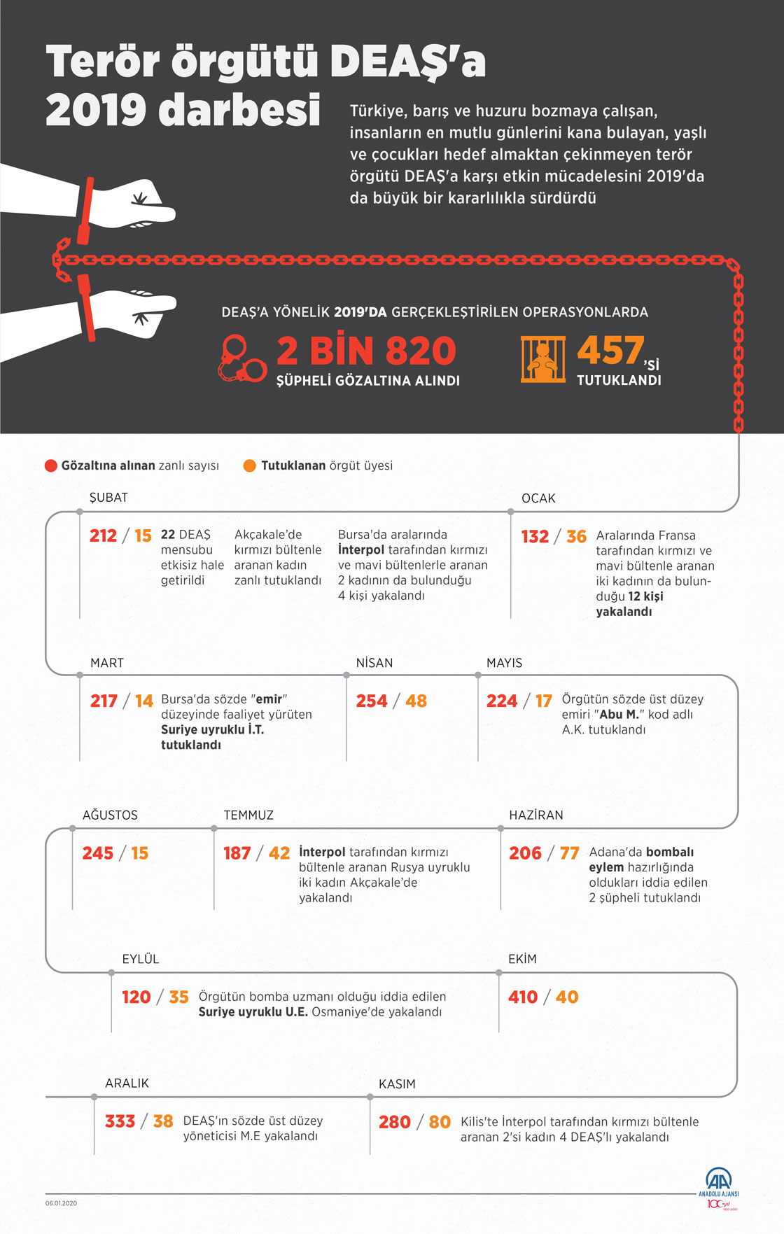 Türkiye, barış ve huzuru bozmaya çalışan, insanların en mutlu günlerini kana bulayan, yaşlı ve çocukları hedef almaktan çekinmeyen terör örgütü DEAŞ'a karşı etkin mücadelesini 2019'da da büyük bir kararlılıkla sürdürdü. ( Elmurod Usubalıev - Anadolu Ajansı )
