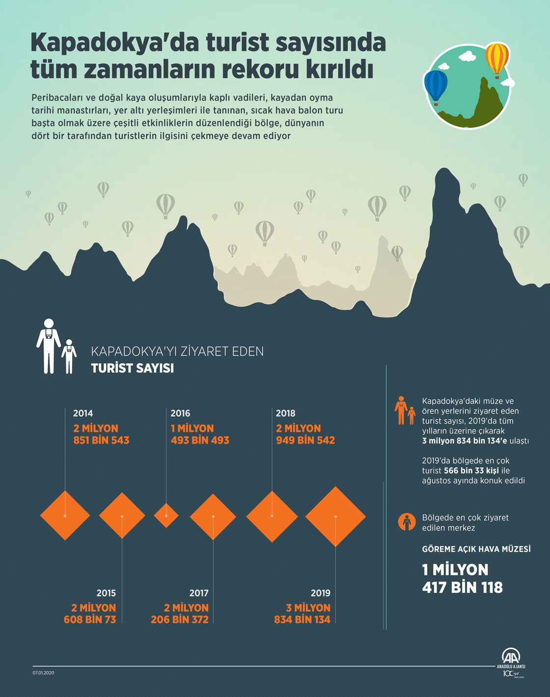Doğa, tarih ve kültür turizminin önemli merkezlerinden Kapadokya'daki müze ve ören yerlerini ziyaret eden turist sayısı, 2019'da tüm yılların üzerine çıkarak 3 milyon 834 bin 134'e ulaştı. ( Kemal Delikmen - Anadolu Ajansı )