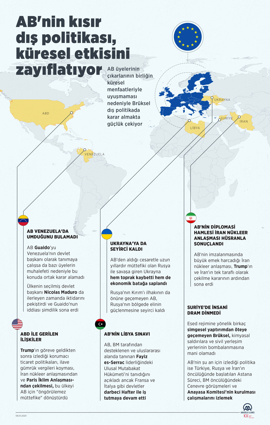 Avrupa Birliği (AB) üyelerinin ulusal menfaatlerinin bloğun küresel hedeflerinden ayrışması, Brüksel'in dış politikada ortak karar almasını zorlaştırırken; çeşitli bölgelerde çıkarına olduğunu düşündüğü planları da hüsranla sonuçlanıyor. ( Elmurod Usubalıev - Anadolu Ajansı )08 Ocak 2020•Güncelleme: 08 Ocak 2020