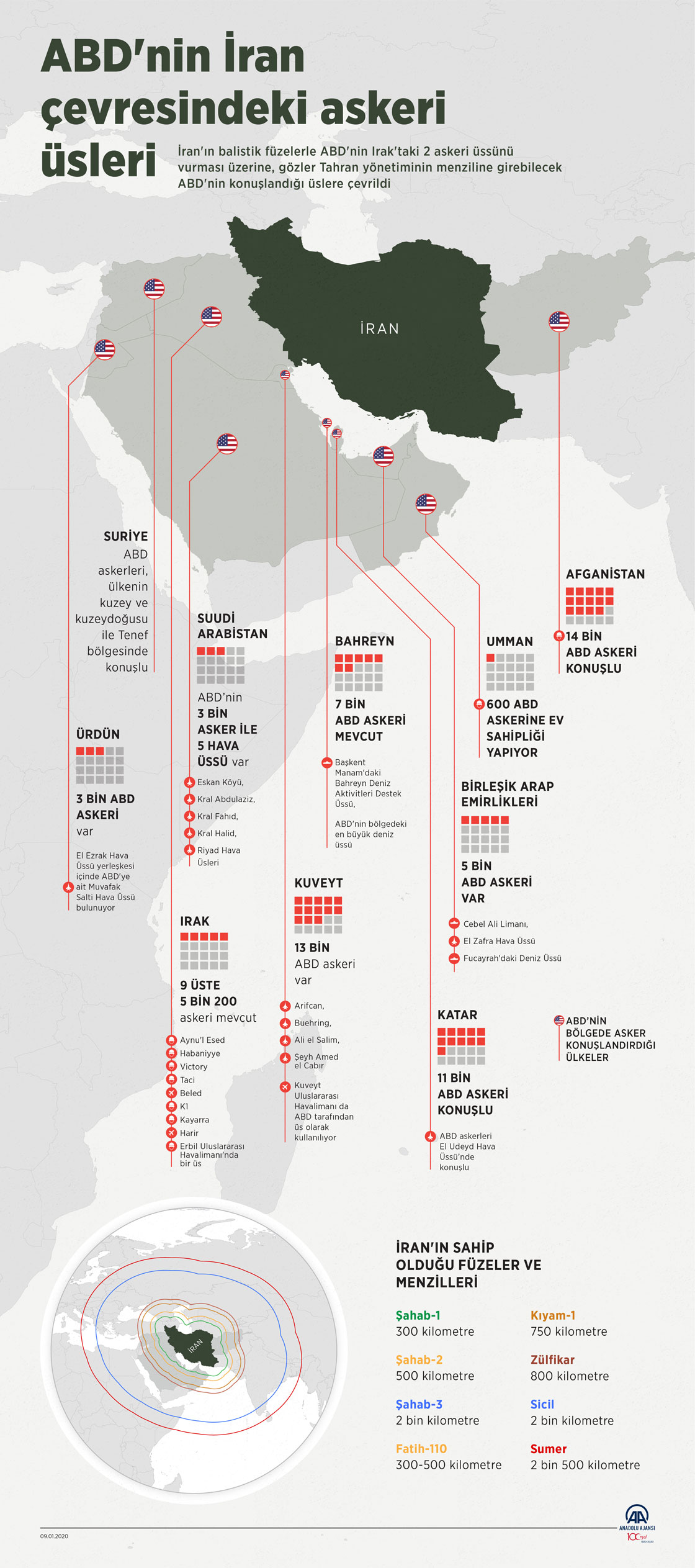 İran'ın balistik füzelerle ABD'nin Irak'taki 2 askeri üssünü vurması üzerine gözler Tahran yönetiminin menziline girebilecek ABD'nin bölgedeki diğer üslerine çevrildi. ( Yasin Demirci - Anadolu Ajansı )