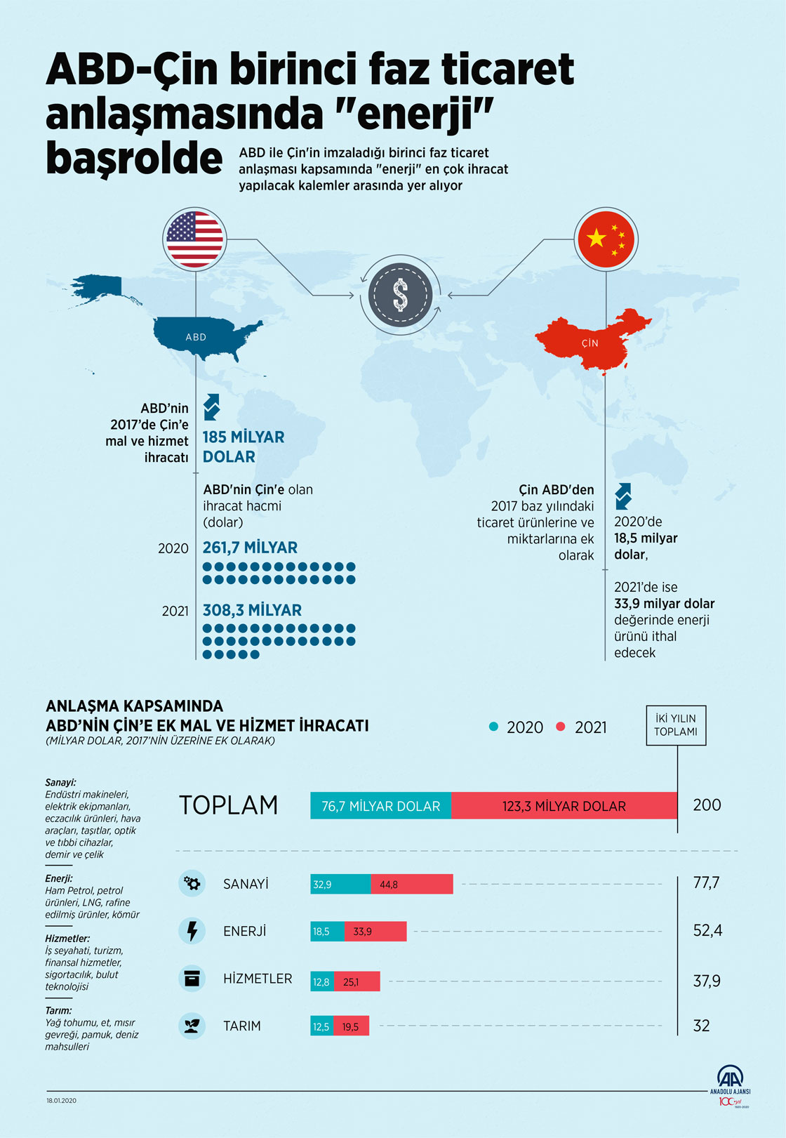 ABD ile Çin'in bu hafta imzaladığı birinci faz ticaret anlaşması kapsamında "enerji" en çok ihracat yapılacak kalemler arasında yer alıyor. Anlaşmadaki ticaret miktarlarına uyulması durumunda, ABD'nin Çin'e ihracatı bu yıl 261,7 milyar dolar, gelecek yıl ise 308,3 milyar dolar olarak gerçekleşecek. Böylece Çin, ABD'den 2017 baz yılındaki 185 milyar dolarlık ithalatına ek olarak bu yıl 76,7 milyar dolarlık, gelecek yıl da 123,3 milyar dolarlık alım yapacak. (Anadolu Ajansı - Ahmet Burak Özkan)18 Ocak 2020•Güncelleme: 18 Ocak 2020
