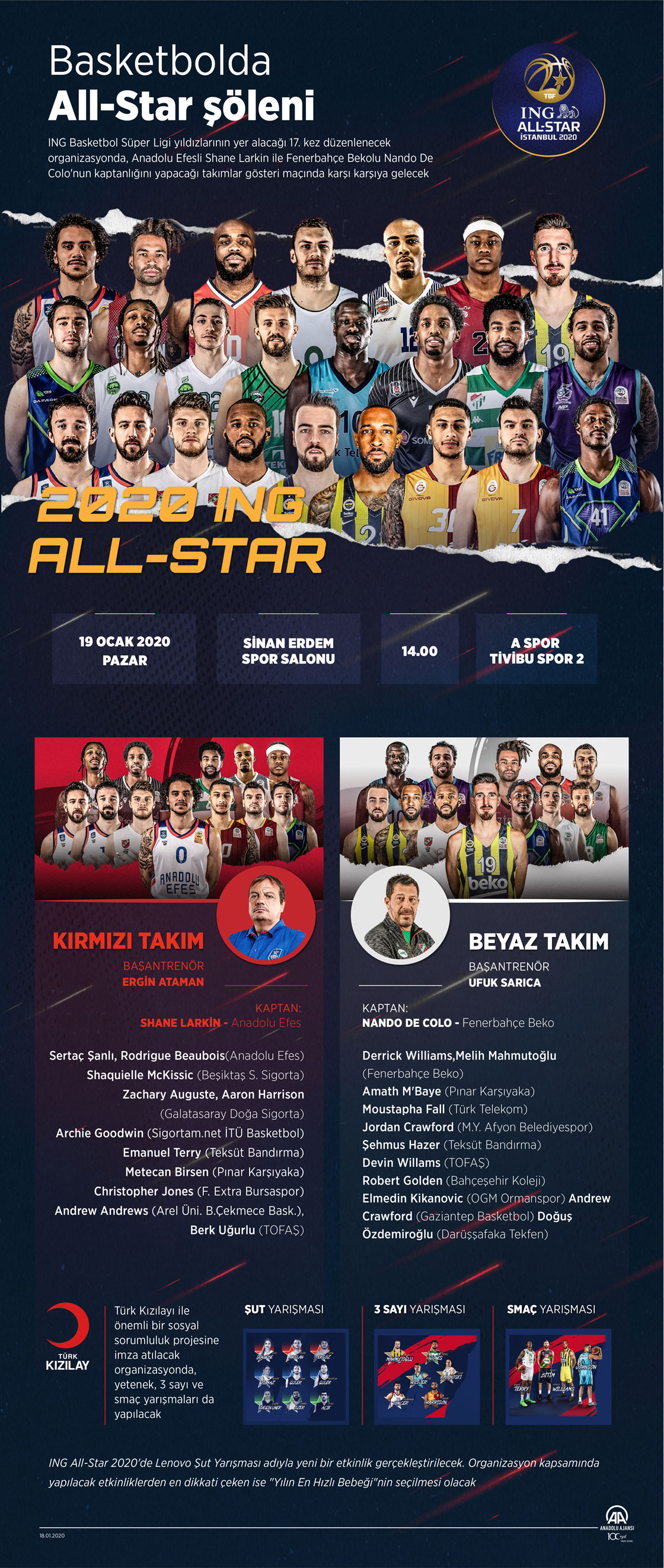 Basketbolun yıldızlarının sahne alacağı ING All-Star 2020, yarın İstanbul'da yapılacak. Bu sene 17. kez düzenlenecek organizasyona, son 2 yılda olduğu gibi yine Sinan Erdem Spor Salonu ev sahipliği yapacak. ING All-Star 2020 saat 14.00'ten itibaren gerçekleştirilecek etkinliklerle başlayacak ve A Spor ile Tivibu Spor 2'den naklen yayımlanacak. (Anadolu Ajansı - Kemal Delikmen)18 Ocak 2020•Güncelleme: 18 Ocak 2020
