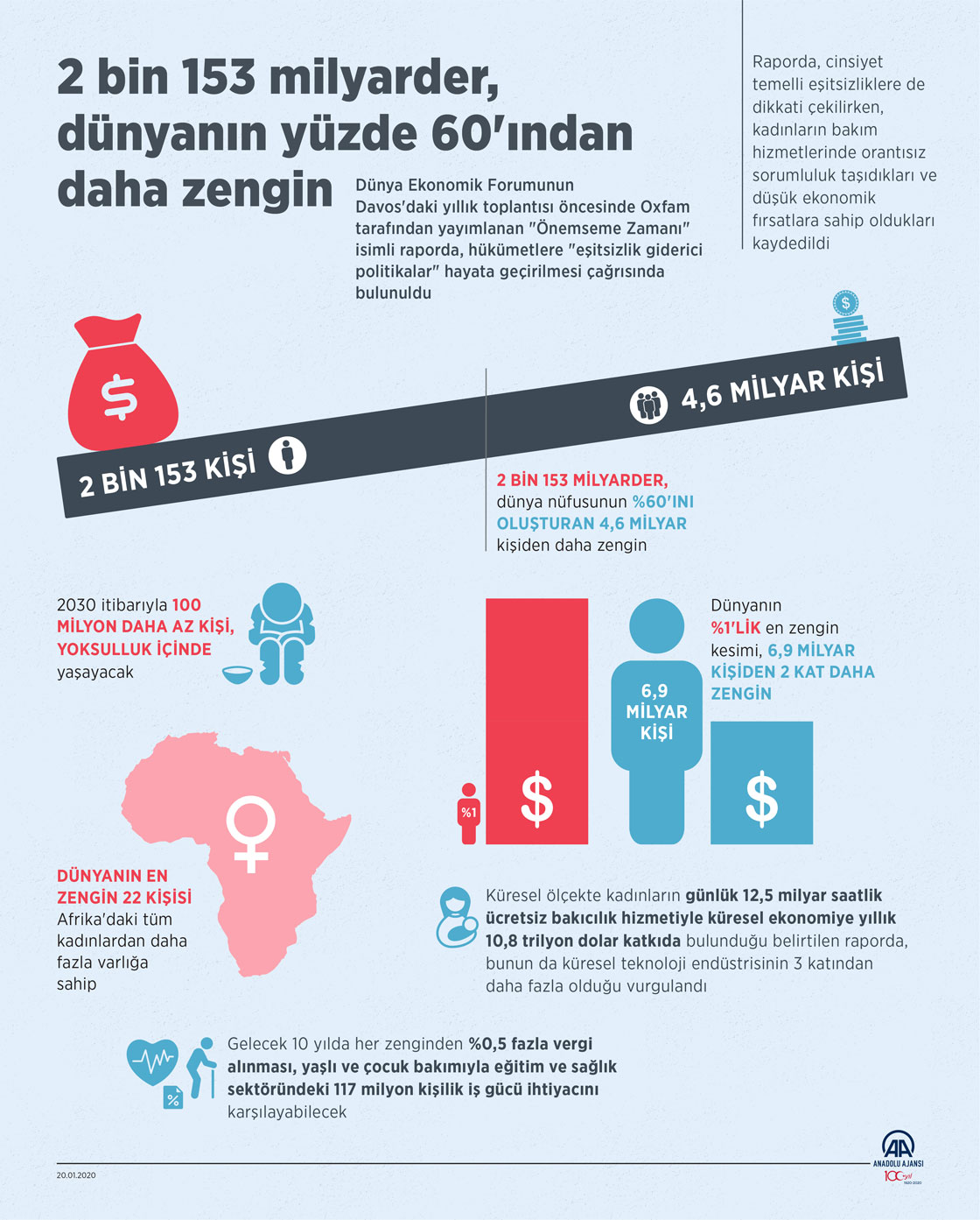 Dünya Ekonomik Forumu'nun Davos'daki yıllık toplantısı öncesinde Oxfam tarafından yayımlanan "Önemseme Zamanı" isimli raporda, dünyanın yüzde 1'lik en zengin kesiminin, 6,9 milyar kişiden 2 kat daha zengin olduğu belirtildi. ( Yasin Demirci - Anadolu Ajansı )20 Ocak 2020•Güncelleme: 20 Ocak 2020