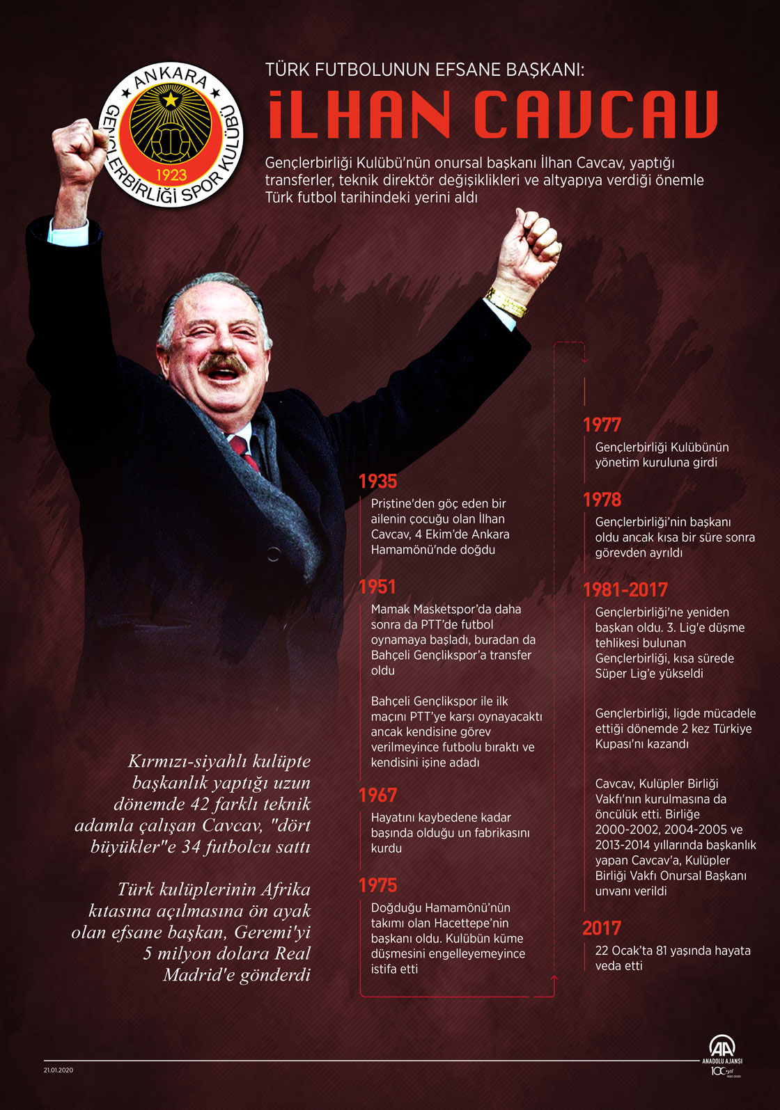 Gençlerbirliği Kulübünün 2017'de hayata veda eden onursal başkanı İlhan Cavcav, yaptığı transferler, teknik direktör değişiklikleri ve altyapıya verdiği önemle Türk futbol tarihindeki yerini aldı. Kırmızı-siyahlı kulüpte başkanlık yaptığı uzun dönemde 42 farklı teknik adamla çalışan Cavcav, "dört büyükler"e 34 futbolcu sattı.22 Ocak 2020•Güncelleme: 22 Ocak 2020