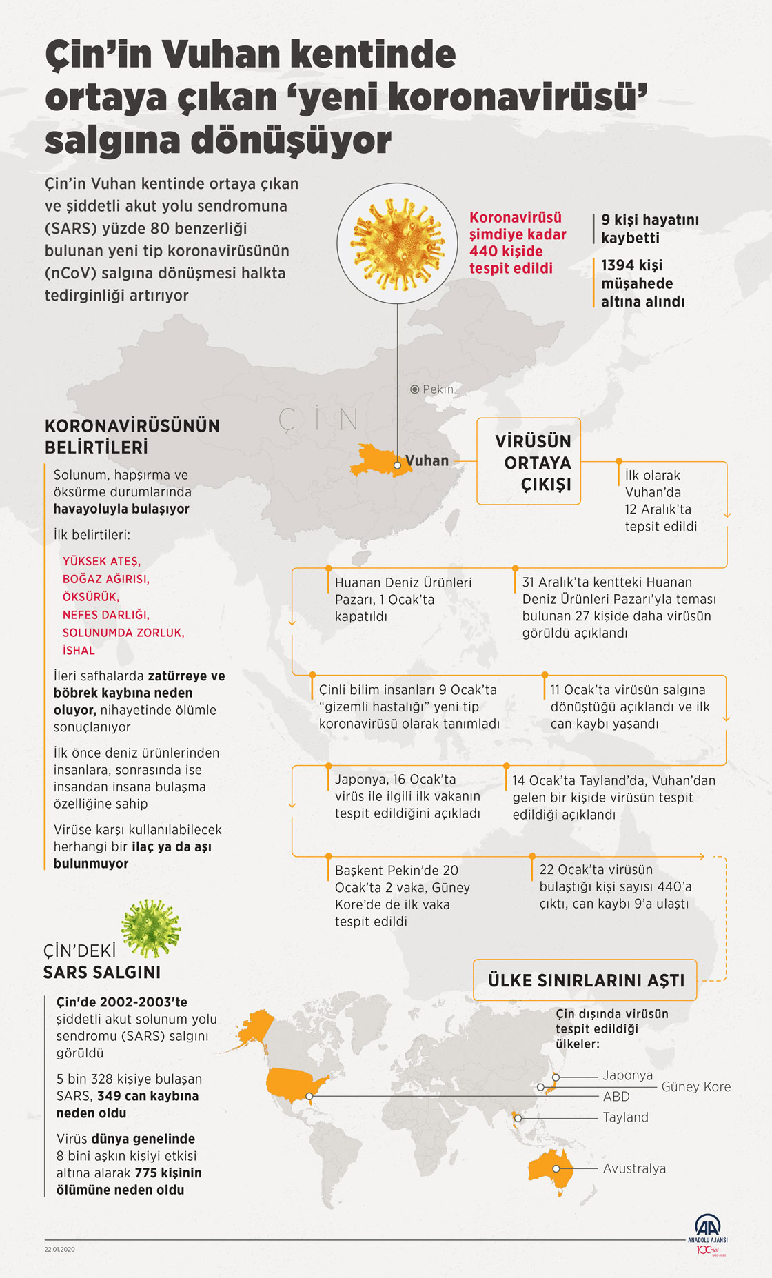 Çin’in Vuhan kentinde ortaya çıkan ve şiddetli akut solunum yolu sendromuna (SARS) yüzde 80 benzerliği bulunan yeni tip koronavirüsü (nCoV) 440 kişide tespit edilirken 9 da can kaybına neden oldu. Henüz aşısı veya ilacı bulunmayan "nCoV"un salgına dönüşmesi halkta tedirginliği artırıyor. ( Elmurod Usubalıev - Anadolu Ajansı )22 Ocak 2020•Güncelleme: 22 Ocak 2020